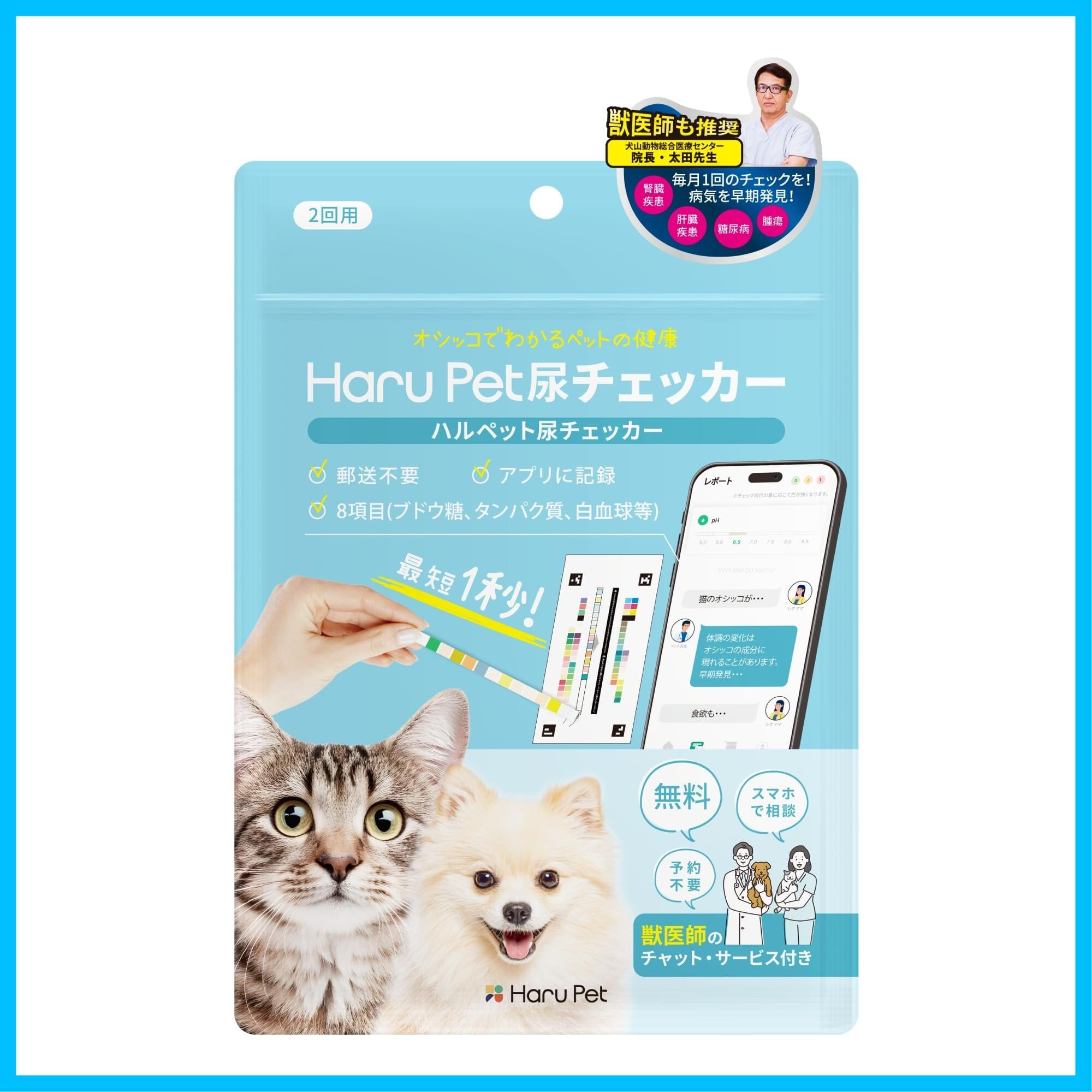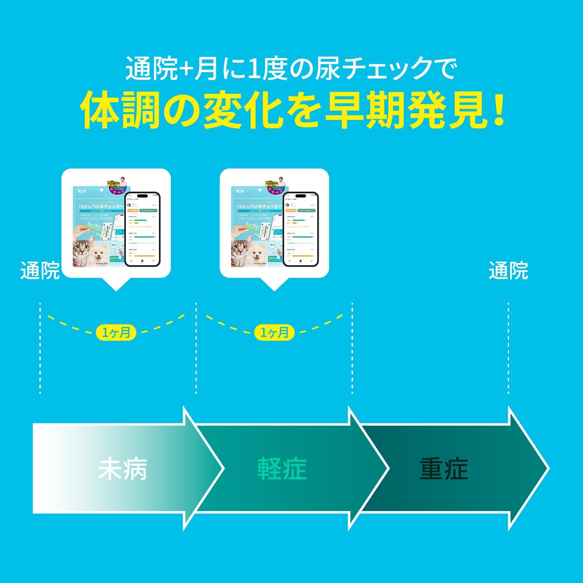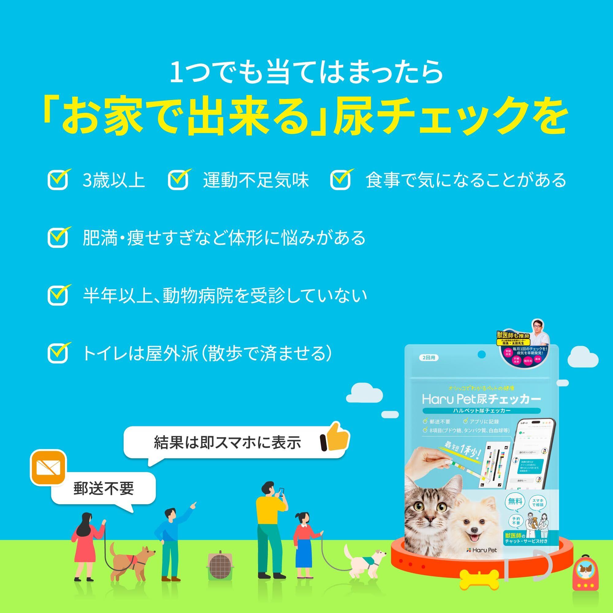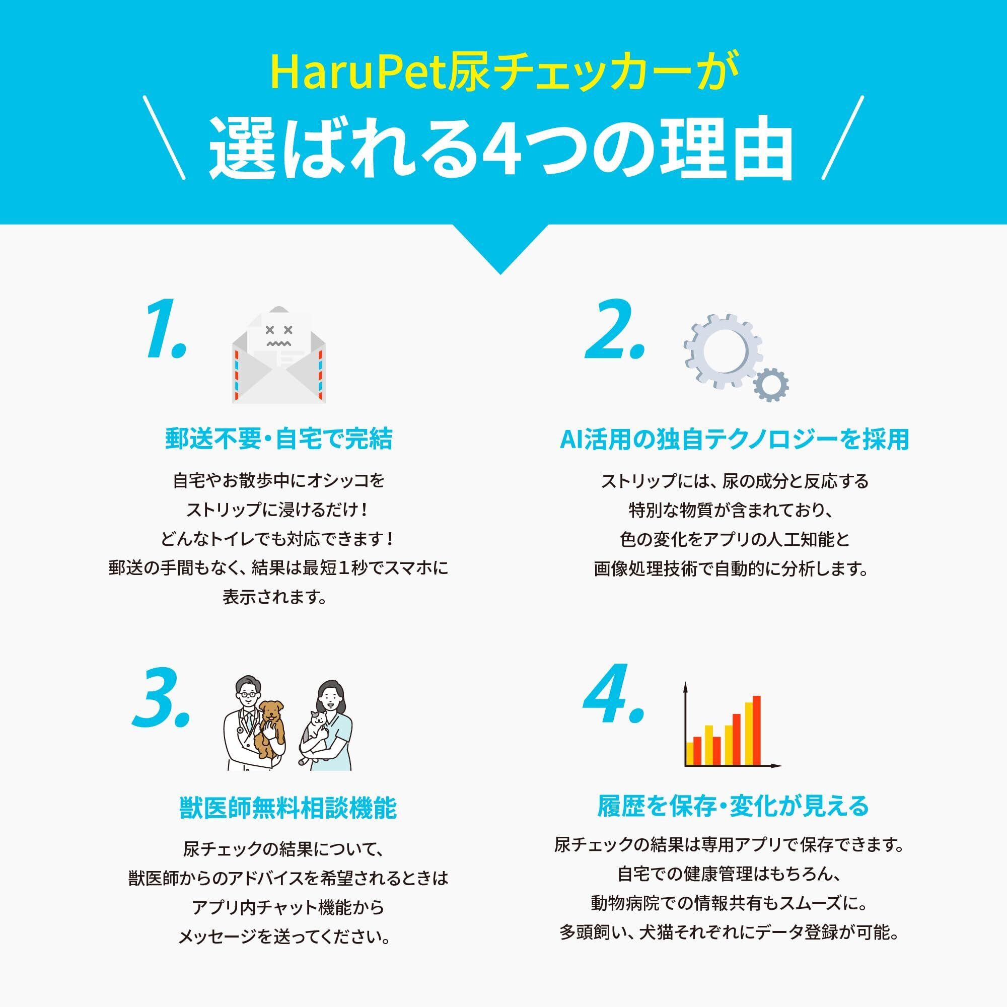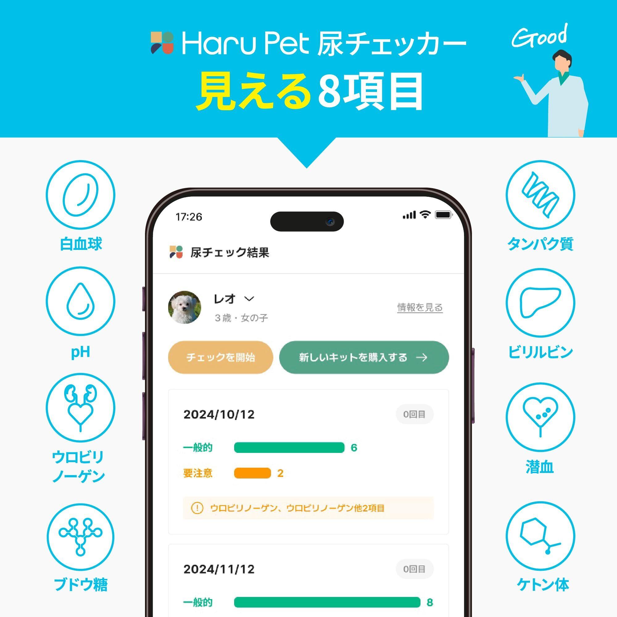 HaruPet 尿チェッカー 獣医師共同開発 獣医師無料相談 アプリ記録 健康管理 病気リスク ペット 多頭飼い対応 生活習慣 最短1秒 犬猫用 おしっこチェック 8項目 スマホ アプリ 郵送不要 早期発見 自宅で簡単出来る pH 1袋_2回分