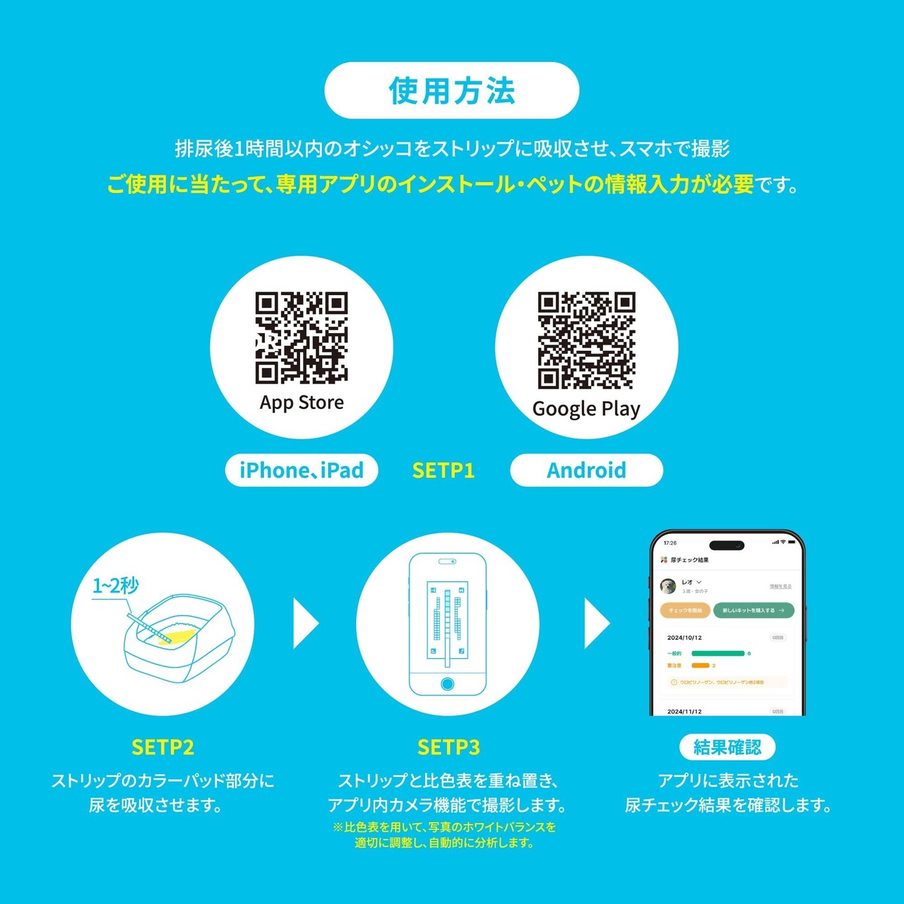 ️ご自宅でサッと検査できる尿チェッカーが新登場。散歩やトイレ掃除のついでにチェックするだけ。特別な準備や時間は不要で、毎日のルーティンに自然に組み込めます。採尿後、スマホで読み取るだけで、最短1秒で結果を確認可能。毎日の健康チェックが、もっと手軽でスマートになります。