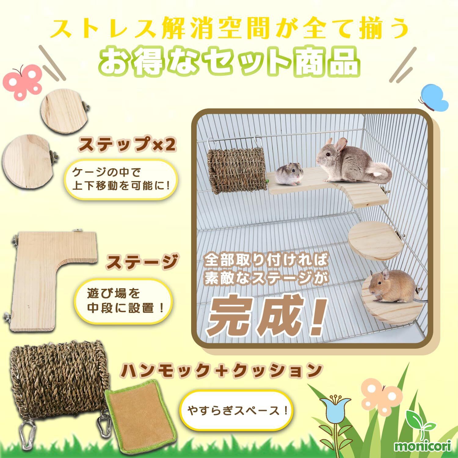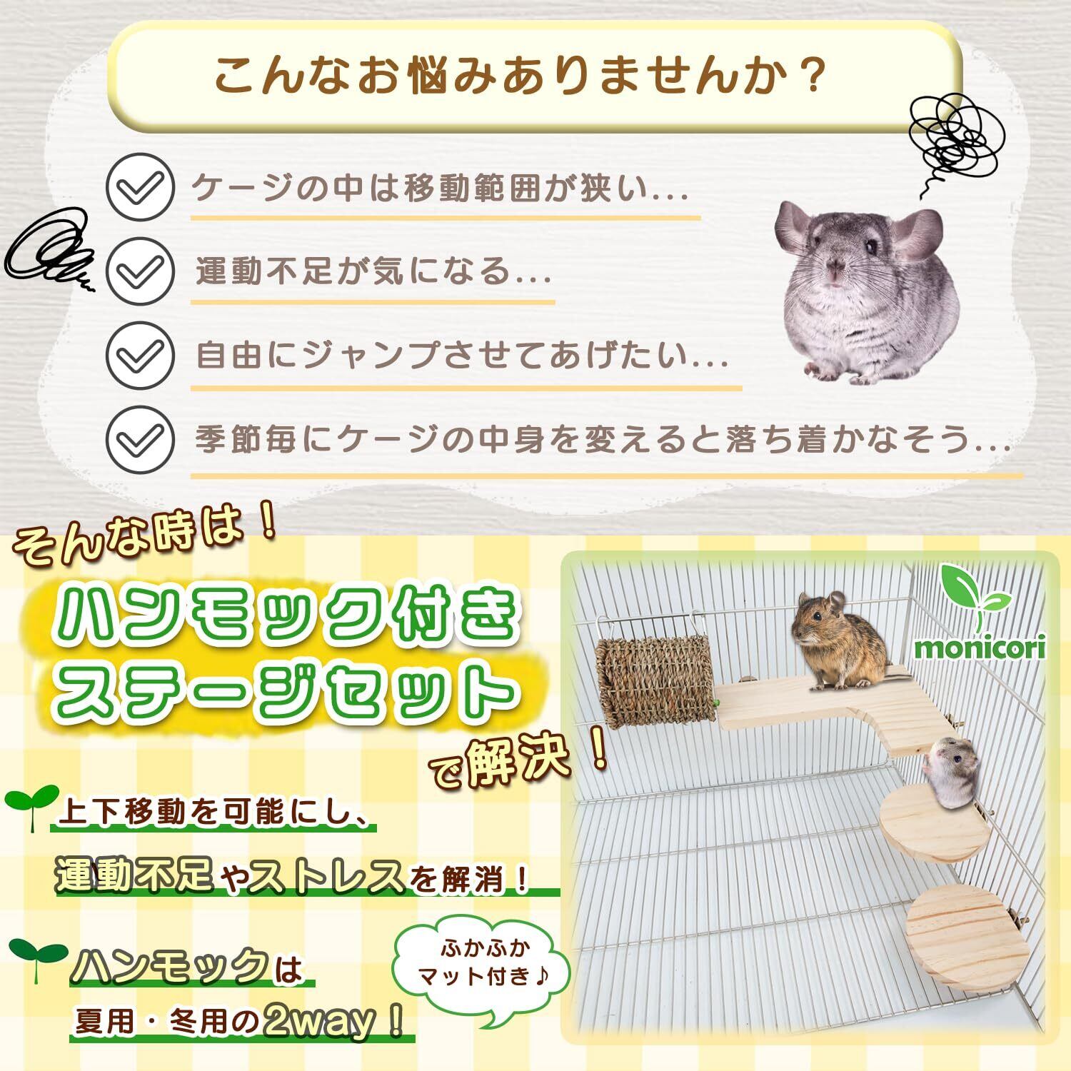 【お気に入り空間をDIY!】 簡単設置 天然木で作られた 小動物 ステップ ステージ ハンモック monicori