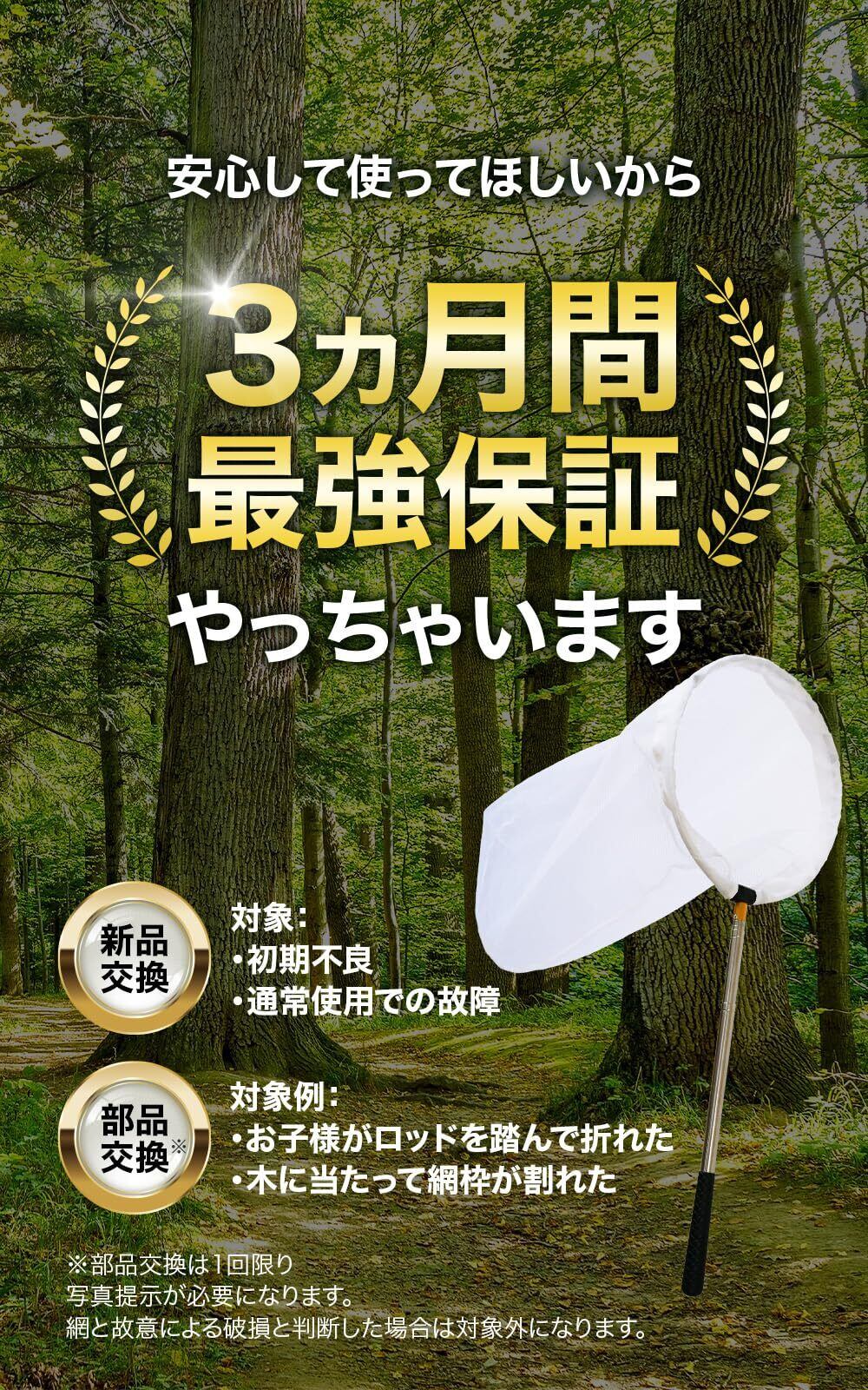 【3カ月間の最強保証】初期不良と自然故障に加えて、アクシデントによりロッドや網枠が壊れた場合も対象となります。《新品交換》初期不良及び通常使用での故障。《部品交換》例:お子様がロッドを踏んで折れた。木に当たって網枠が割れた。*部品交換は一回限り。写真のご提示が必要になります。網は対象外。故意による破損と判断した場合は対象外。