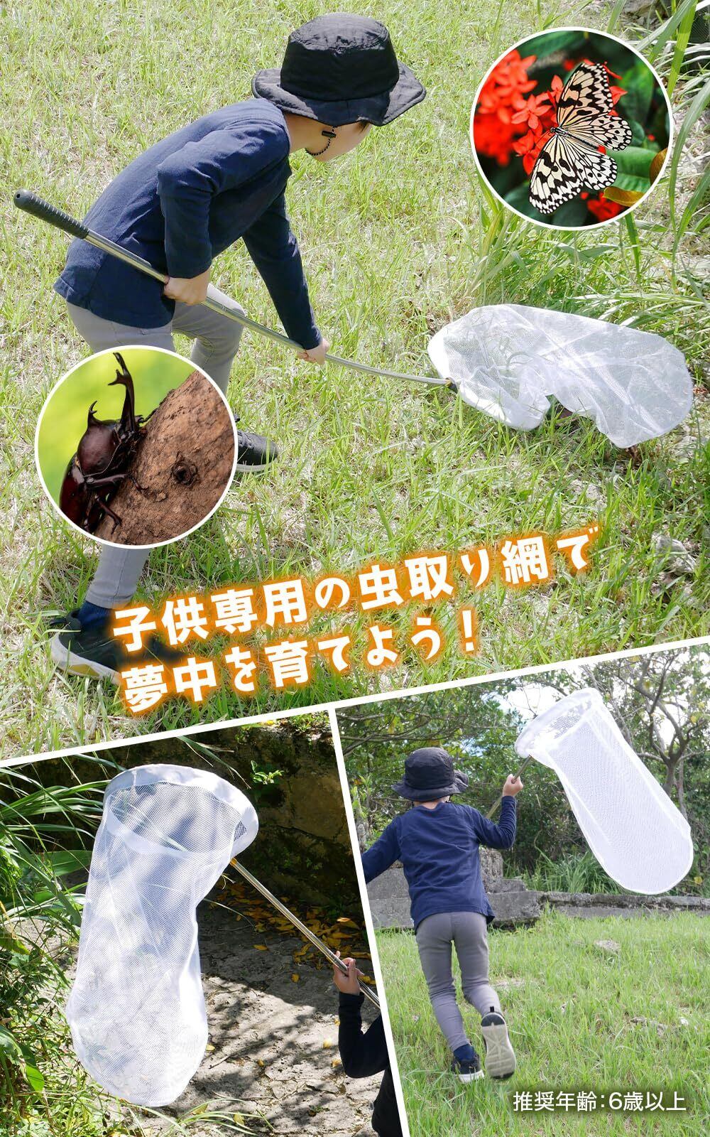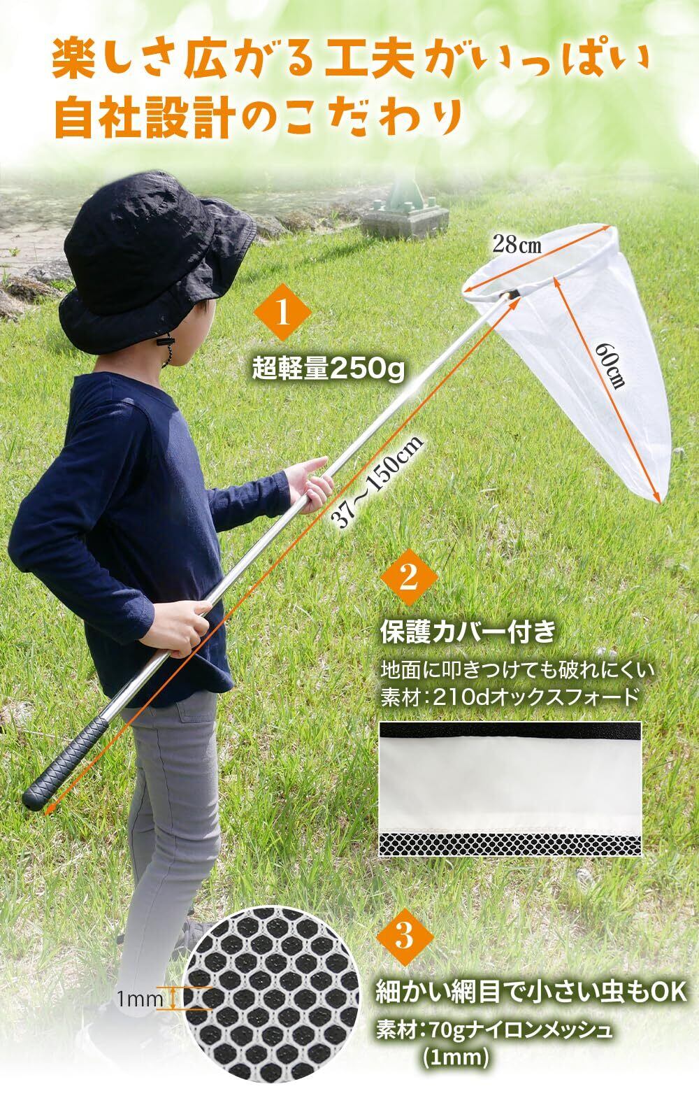 【子供専用の虫取り網】推奨年齢は6歳以上。こだわりの自社設計の虫取り網。超軽量の250gなので子供でも扱いやすい。お子さんがつい網を地面に叩きつけてしまっても網破れ防止保護カバー(素材:210dオックスフォード)で破れにくいため安心!素材は70gナイロンメッシュを使用し丈夫な生地を丁寧に裁縫。網目は1mmだから小さな虫を逃さない。網に十分な深さ(60cm)があるため、捕まえた後に逃げられにくく、昆虫が傷つきにくい。