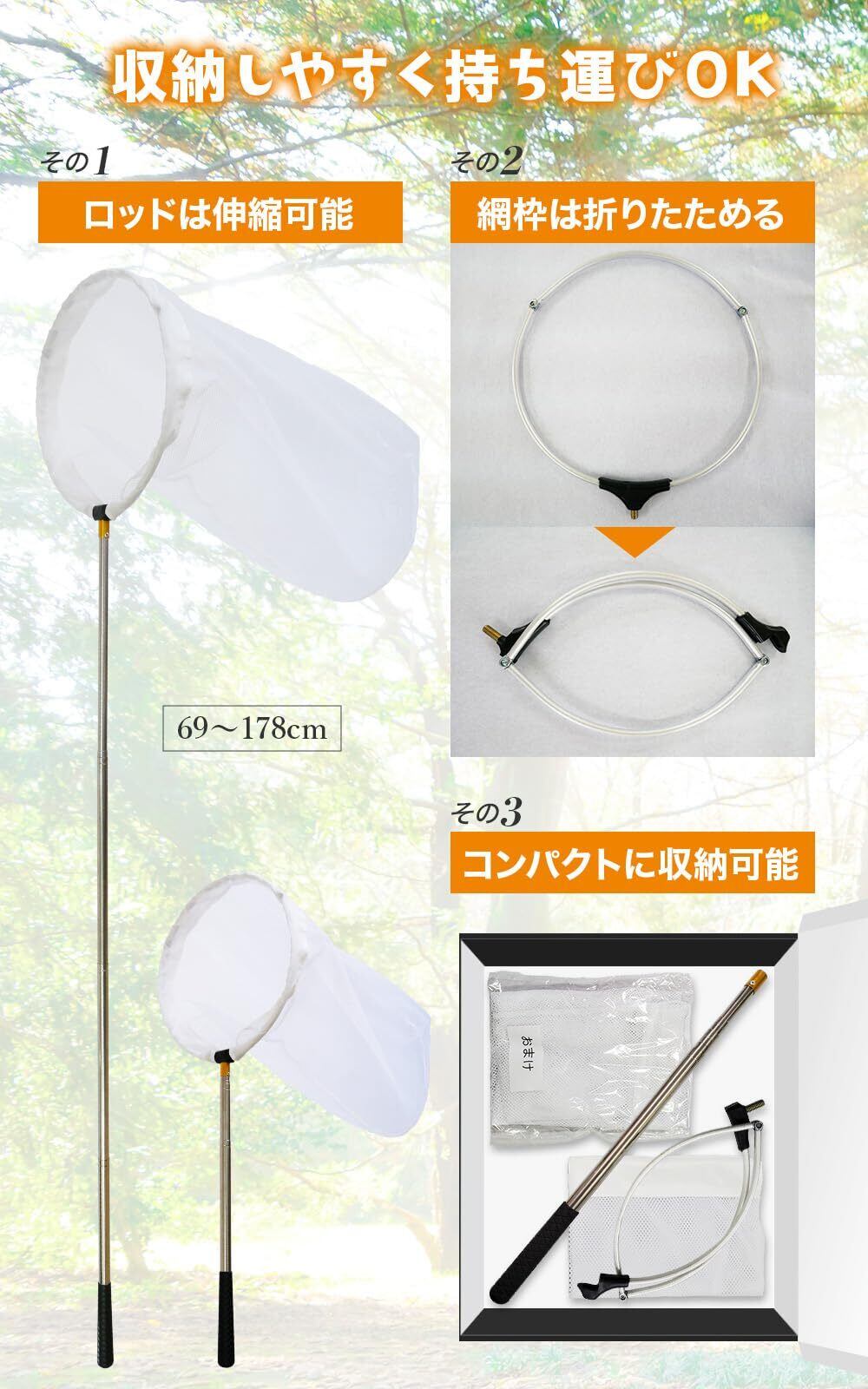 【ロッドの仕様】つなぎ目のロック機能で軸の空転を防ぐから、網を振った時に軸が空転しない!素材は丈夫なステンレス製を採用。5段伸縮(69-178cm)で好きな長さに調節可能!人間工学に基づき設計された持ちやすいグリップ。