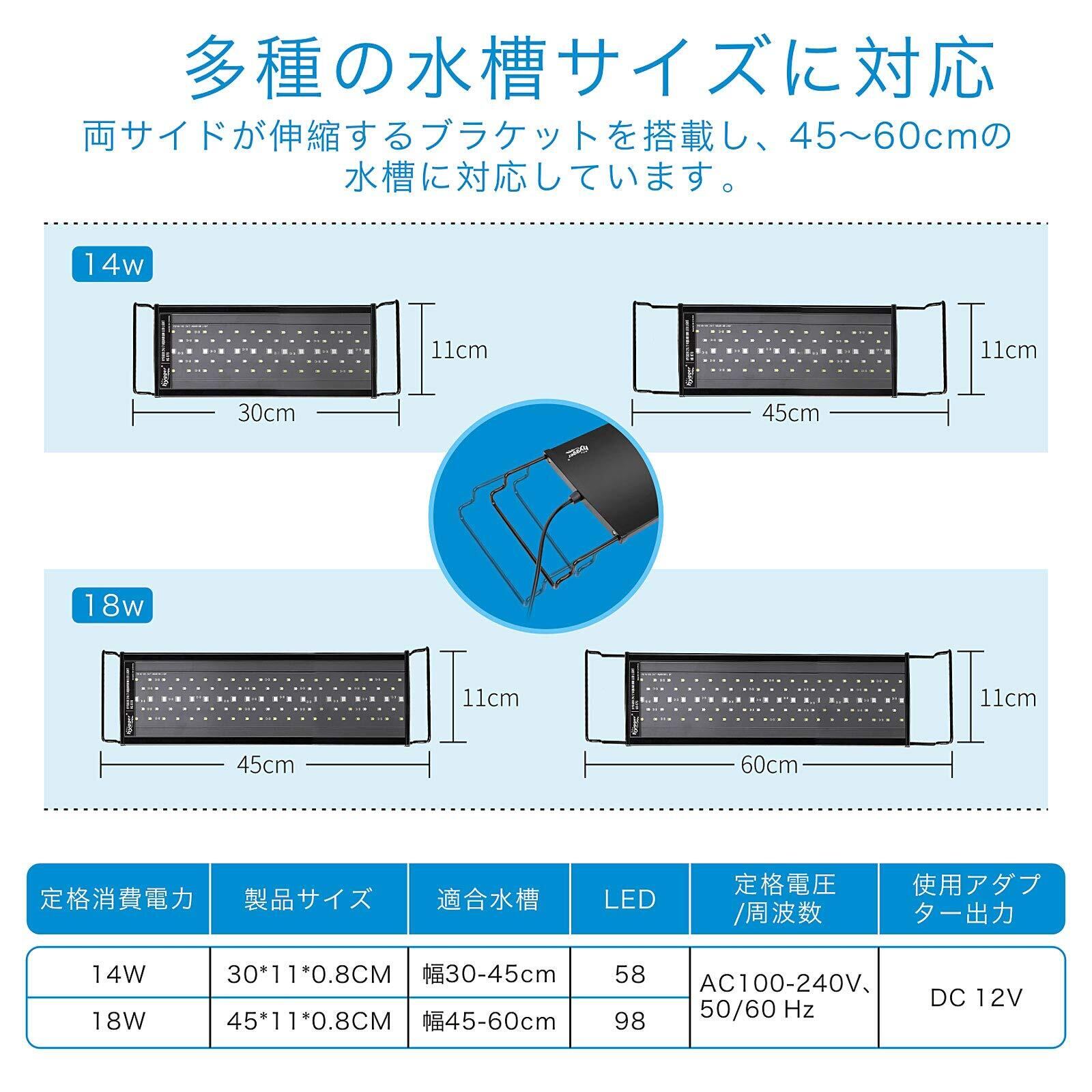 【長寿命・便利・安全】01アクアリウムライトは収縮可能なブラケットを使って、45~60cmの水槽に対応しています。02抗酸化性に優れ、使用寿命60000時間のLEDライトの安定した仕様も保障します。03分離可能なアダプターは、再利用できます。 04水槽用ライトは散熱性の高いアルミ合金を主体としており、スムーズな散熱を保証します。注:ライトが点灯していない場合、アダプターが損傷している可能性があります。 無料の交換用アダプターについては、お問い合わせください。