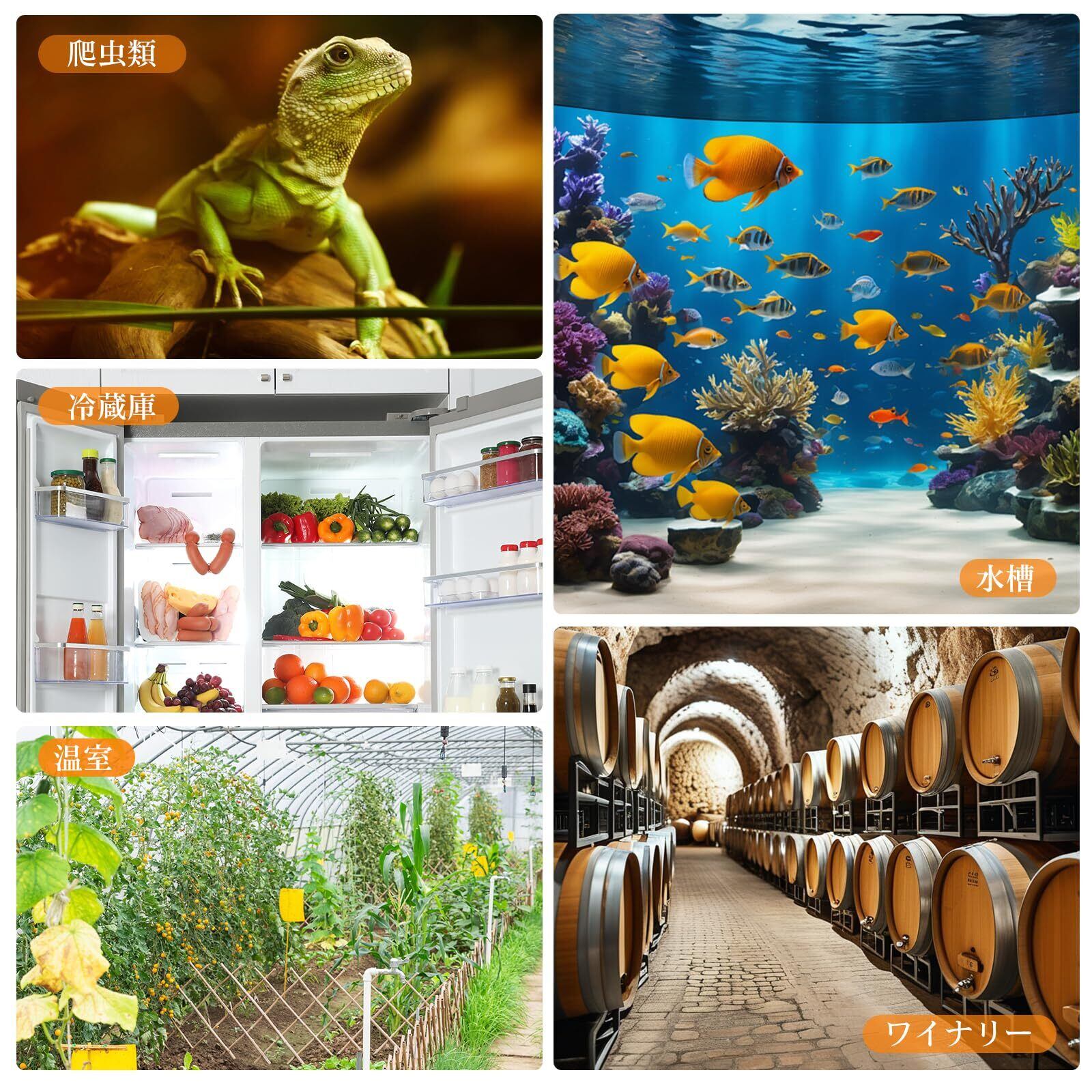 【幅広い用途】この温度調節器は、冷蔵庫、孵卵器、鶏舎、ガラス容器、養殖、温室、家庭など、温度と湿度が要求される場所に適しており、さまざまな場面で使用できる。また、水槽の温度を維持するための水槽用ヒーターの温度調節にも使用できる。