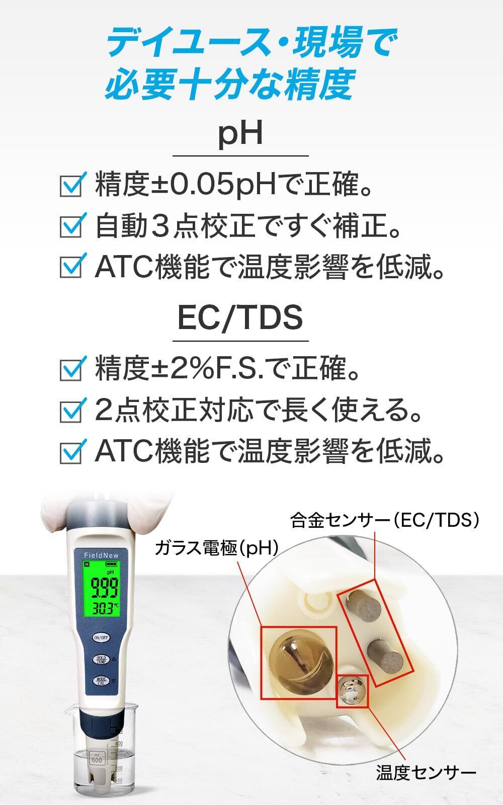 【正確に測れます!】本製品は本体内部ではなく測定部に温度センサーを搭載しており直接水温を測ることができます。サンプルの水温に基づき、温度補正係数を使用して、測定値を25℃基準に自動で補正します。この機能により、温度変化による測定誤差を最小限に抑えることができ、より正確なpH値を測定することができます。pHは3点、EC/TDSは2点での校正が可能でより正確な測定値を確保することができます。pHは高品質ガラス電極、EC/TDSは高性能合金センサー採用により正確な測定結果が得られ、様々なシーンで活躍できます。