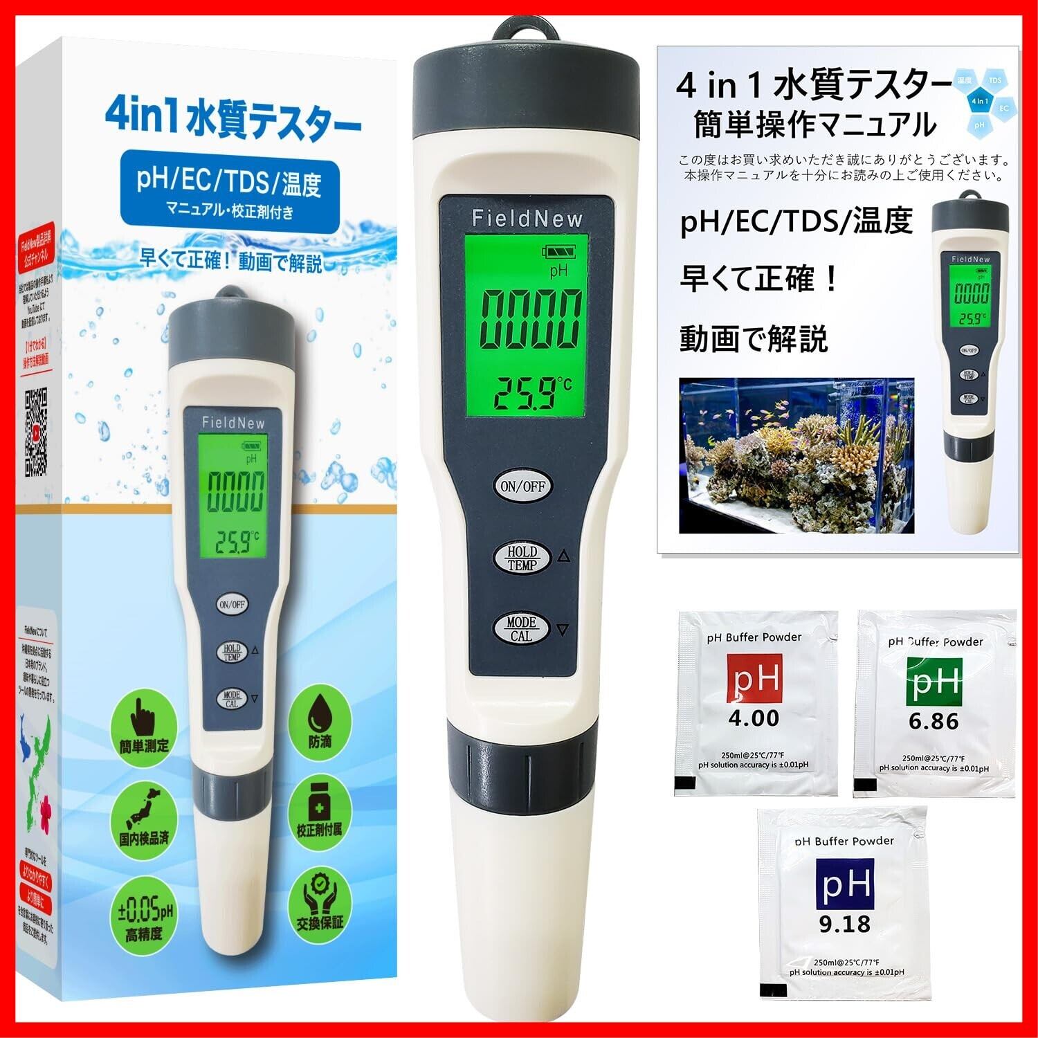 FieldNew 【国内ブランド】pH測定器 水質測定器 (pH/EC/TDS/温度) 防滴 国内品質検査済 保証書付き 高精度 自動校正 4 in 1 簡単操作マニュアル 動画解説 校正剤付き アクアリウム 水槽管理(淡水用) 純水器フィルター