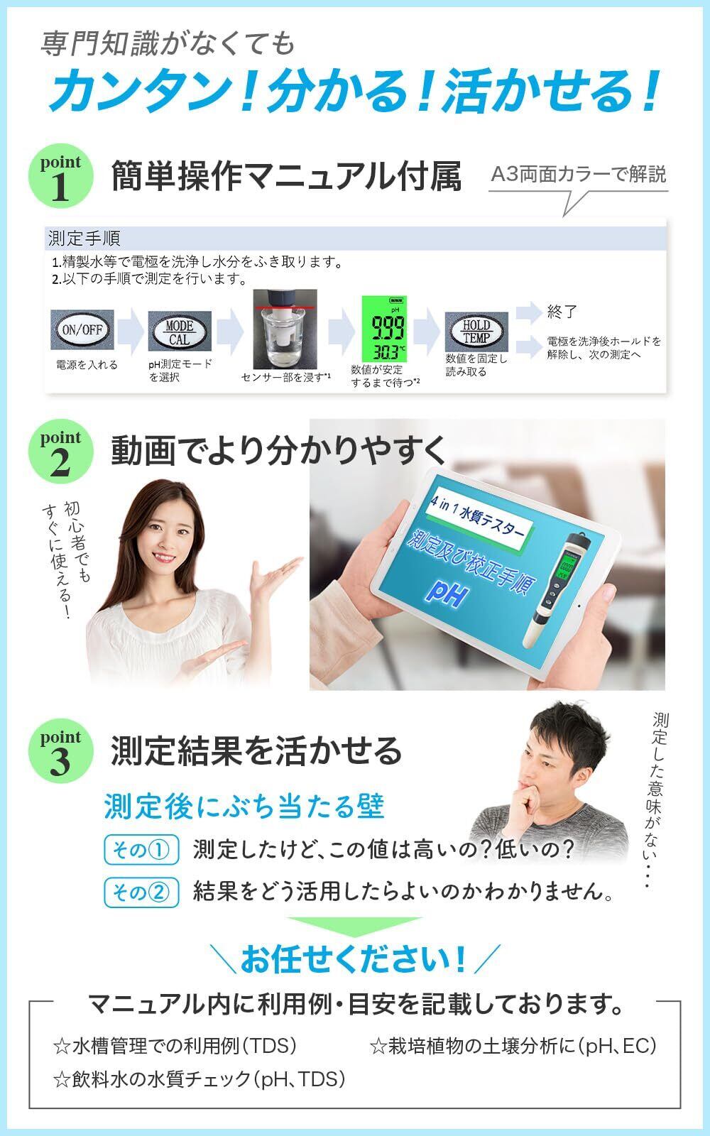 【簡単に操作できる!】測定モードを選択しサンプルに漬けるだけで簡単に測定できます。A3両面カラーの簡単操作マニュアルで、誰でも簡単に操作できます。また、動画でも測定や校正の手順を説明しているので、初めてでも分かりやすい。さらに、マニュアル内に「校正頻度の目安」や「各測定項目の説明」、「利用例や目安(水槽管理での利用例や飲料水の水質チェック」を記載しているので測定後の結果の活用の参考にすることができます。