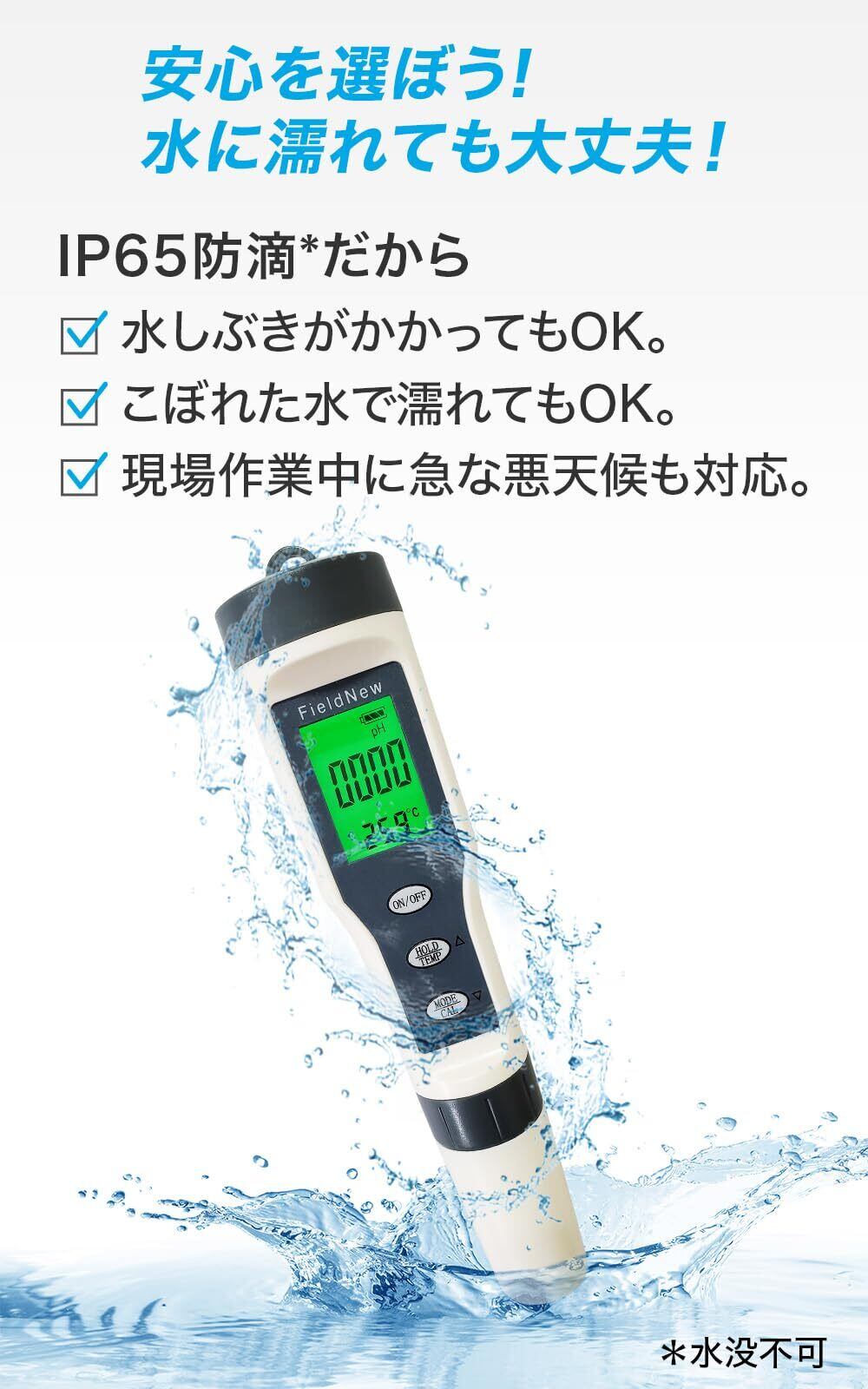 【様々な用途に】4つの項目(pH、EC、水温、TDS)を測定できるから、アクアリウム、水槽管理(海水不可)、メダカの飼育管理、健康管理、液肥の調整(原液不可)、飲料水、水道水、プール、事業用・研究用など様々な用途で活用できます。防滴仕様なので水しぶきがかかっても、こぼれた水で濡れても大丈夫。野外調査や現場作業中の急な悪天候にも対応できます。また、バックライト機能搭載で夜間や暗い場所でも活躍します。
