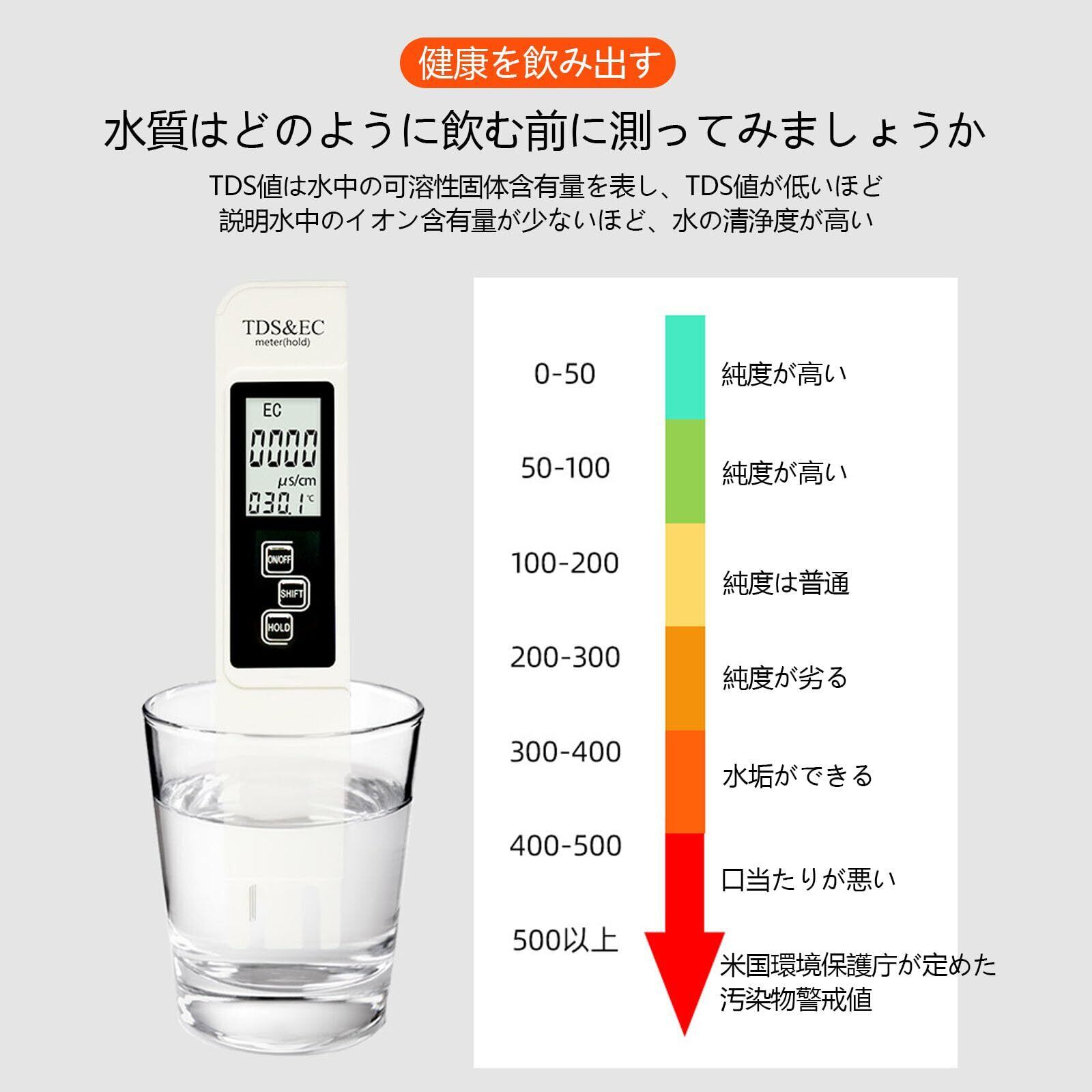 【使いやすさ】 TDSメーターをオンにして、チタン合金プローブを水に入れ、穏やかに水をかき混ぜます安定した測定値が数秒でLCDに自動ブロックされ、5秒で水質がわかります。