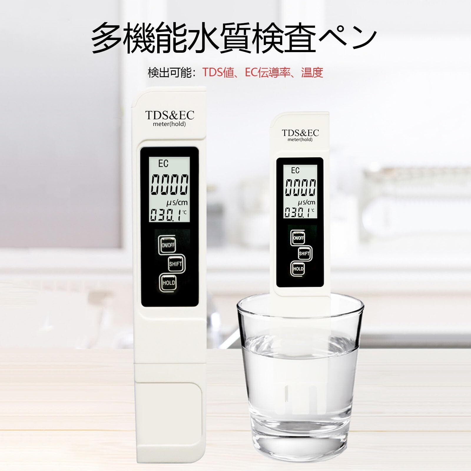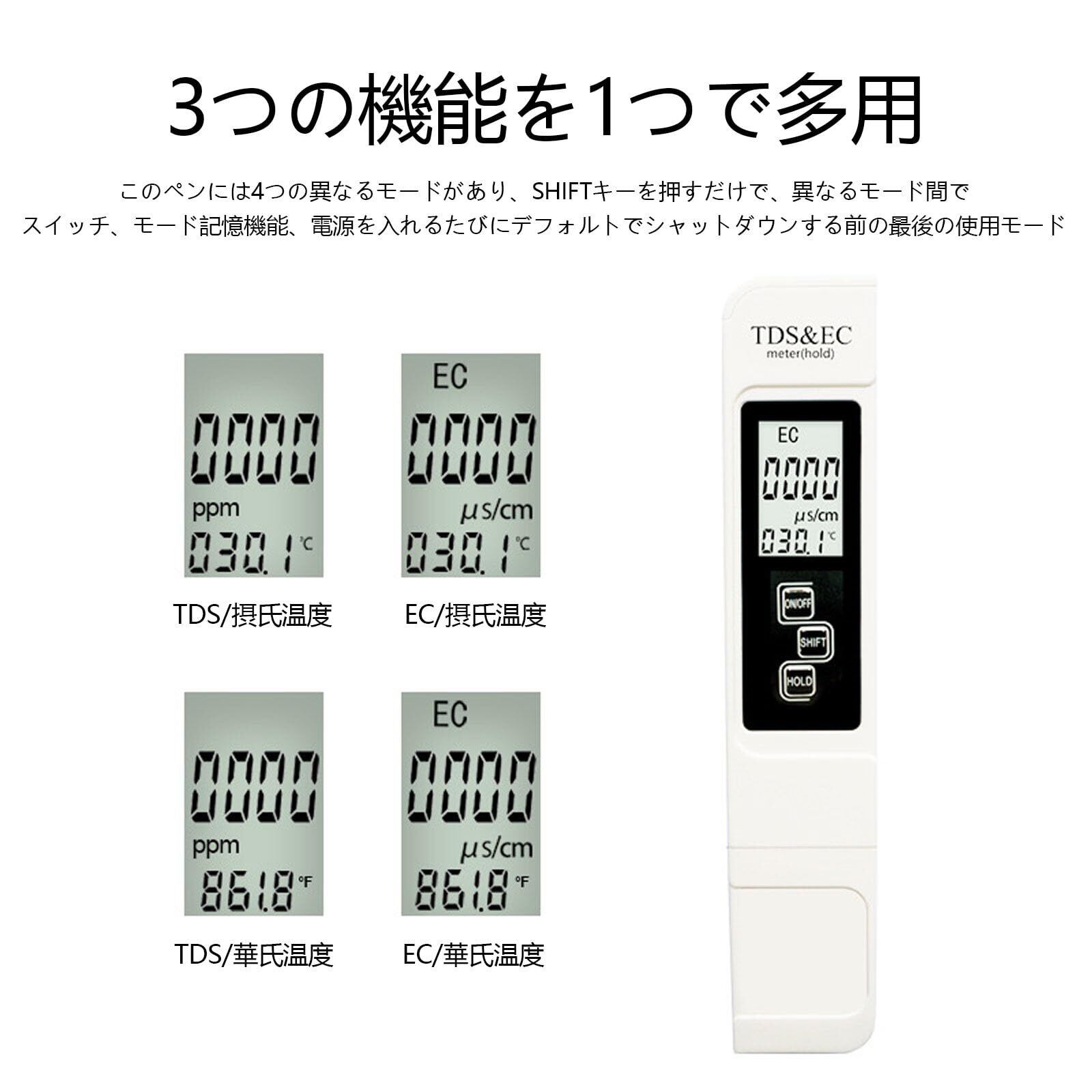 【測定範囲】水質測定器TDS、EC、および液体温度3-in-1,SHIFTボタンを押すと、TDSメーターとECメーターを切り替えます;水温も同時に測定可能,水質(TDS):0-9990ppm、導電率(EC):0-9990us / cm、温度テスト範囲:0.1C-80.0C精度:2%;異なる条件の下で水質を測定することができます。