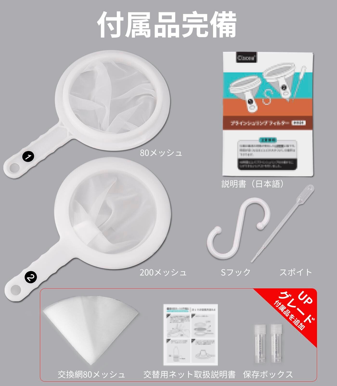 付属品更新:【交換網80メッシュ】*1;【保存容器】*2; [スポイト]*1; [S字フック]*1が付属します。