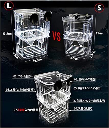 材質:産卵ケースはアクリル製です。魚にとって安全な材料で作られた製品です。透明の特性は飼い主が魚をよく観察なることできます。