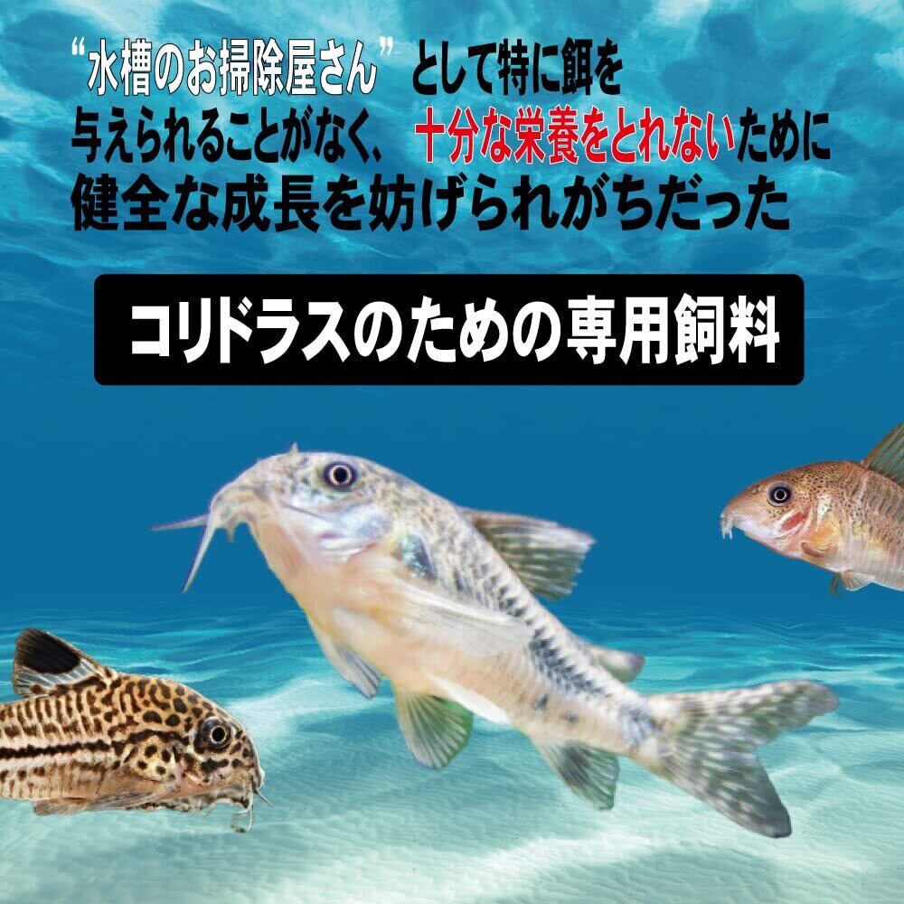 【コリドラスの食べ方に合わせた特殊配合】 エサを少しずつ食べるコリドラスのために徐々に柔らかくなる特殊配合。コリドラスが飽きることなく食べ続けます。