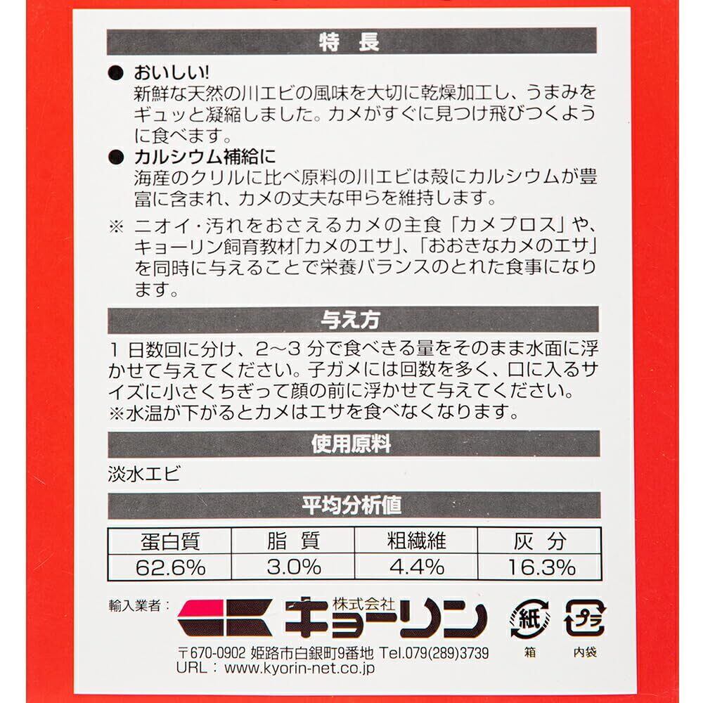 水棲カメ専用の天然飼料です。カルシウムいっぱいの天然川エビ100%で甲羅が丈夫になります。