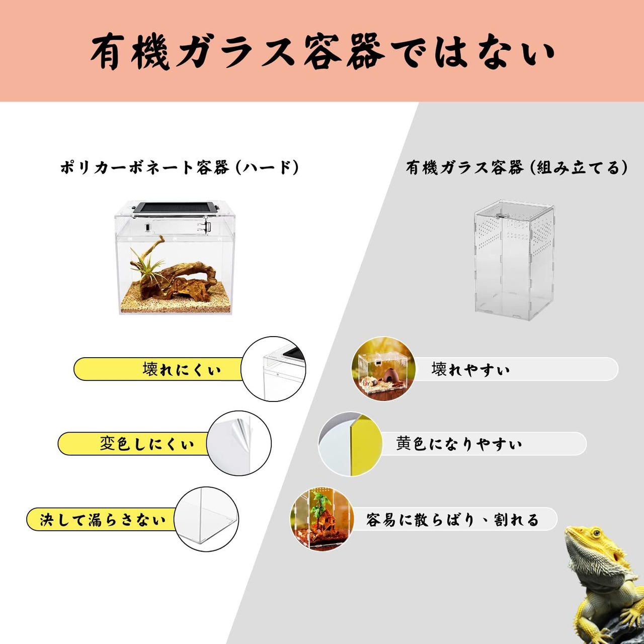 【360度全視野透明水晶防爆プラスチック】上質な厚手、超高硬度水晶防爆プラスチック材質を採用して、より安全です。 この爬虫動物ケース最大の特徴は、爆発防止と落下防止、98%を超え、長期使用後黄変しません。 この爬虫物のタンクの温度は-20℃から120℃まで耐えることができます。 砂漠の動物にとって理想的な生息地です。