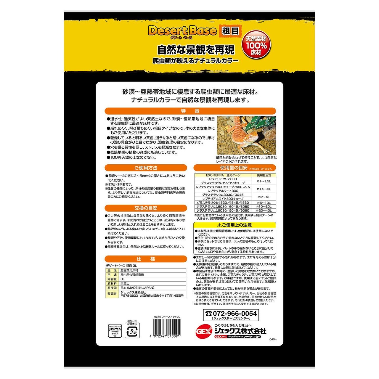 ジェックス エキゾテラ GEX EXOTERRA デザートベース 粗目 3L 通水性・通気性がよい天然素材 砂漠・亜熱帯環境 湿度管理
