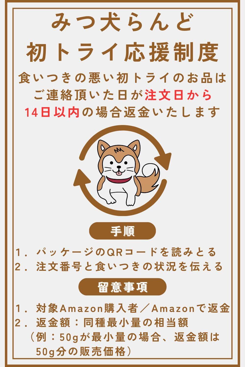 【初トライ応援制度】万が一、初めてのお品で食いつきが悪い際は、注文日から14日以内の場合、返金いたします。≪手順≫1. パッケージのQRコードをお読み取りください。2. 注文番号と食いつきの状況を教えてください。