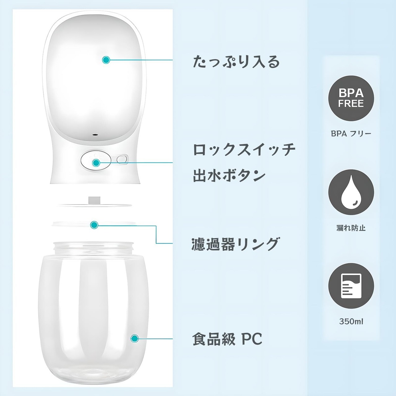 DKPlus ペットウォーターボトル 給水器 犬猫など 多種ペット携帯用水飲みボトル 水槽付き 水漏れ防止 手軽に水分補給が出来 犬の散歩 ランニング アウトドア ドッグウォーターボトル ペット水飲み器 (白, 350ml)