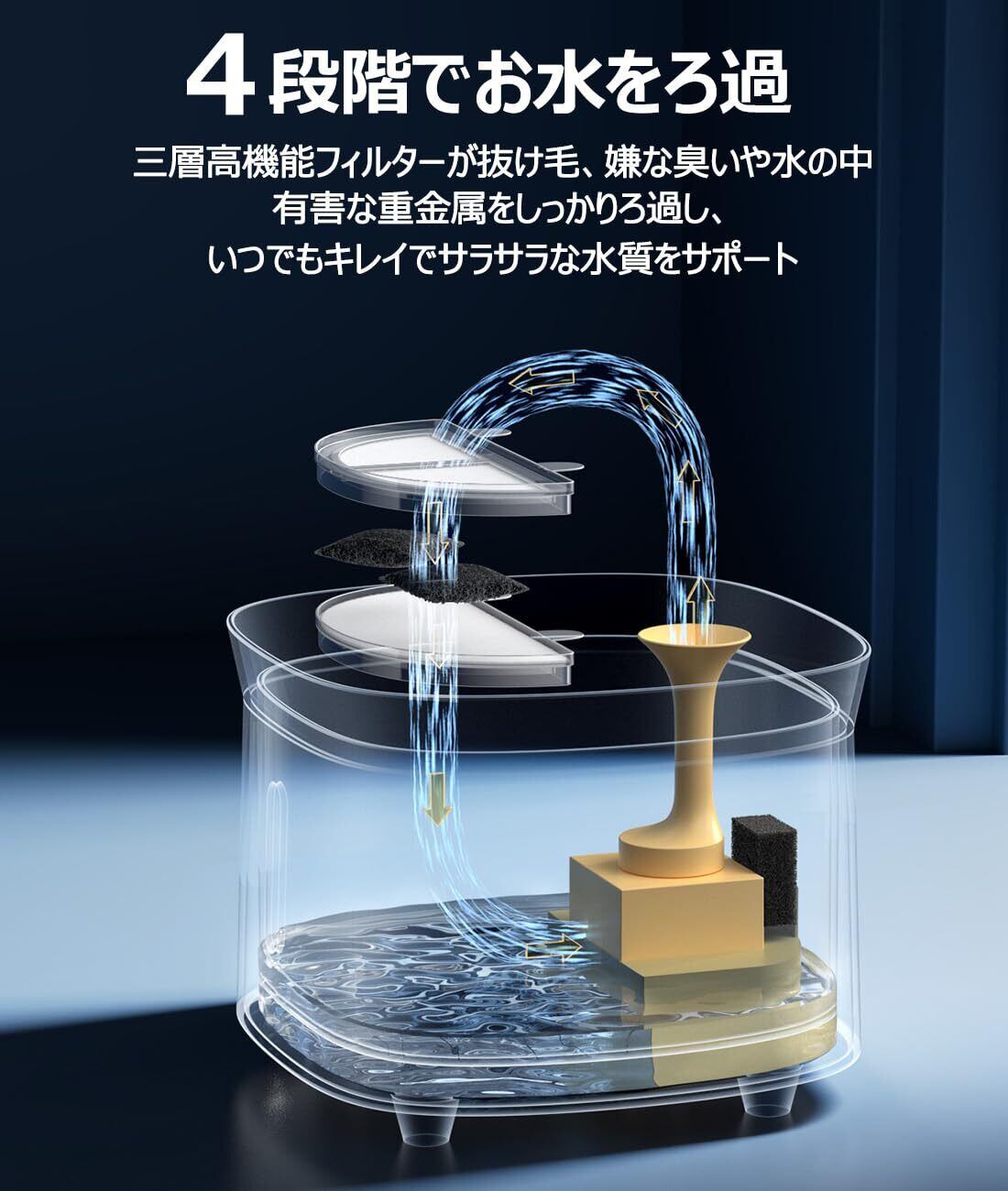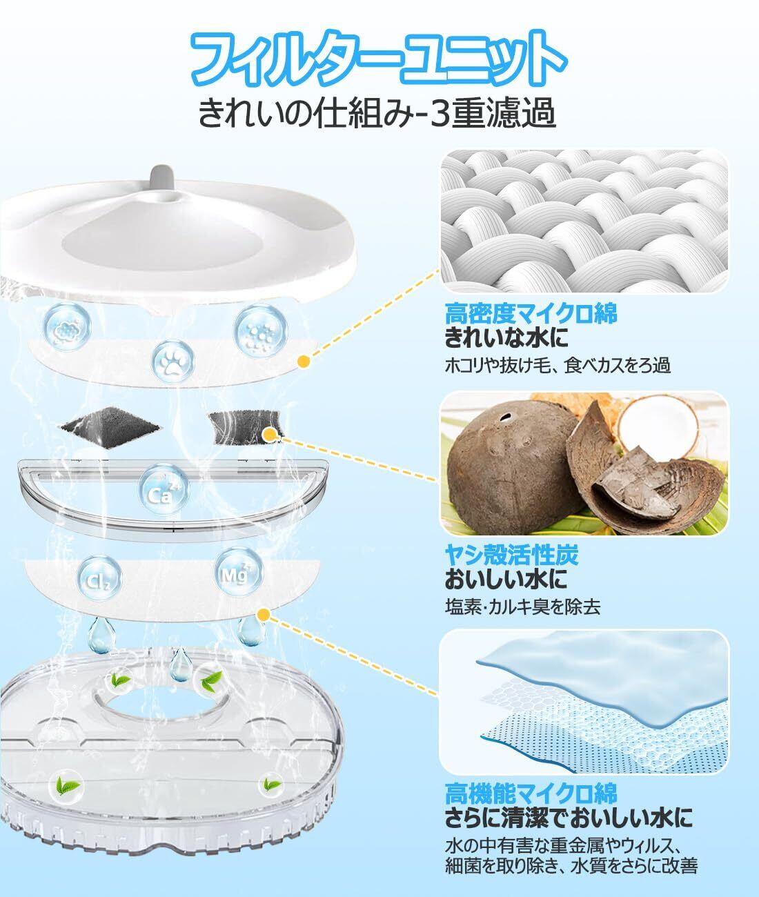 【軟水化フィルター】三層高機能フィルターが抜け毛、嫌な臭いや水の中有害な重金属をしっかりろ過し、いつでもキレイでサラサラな水質をサポート