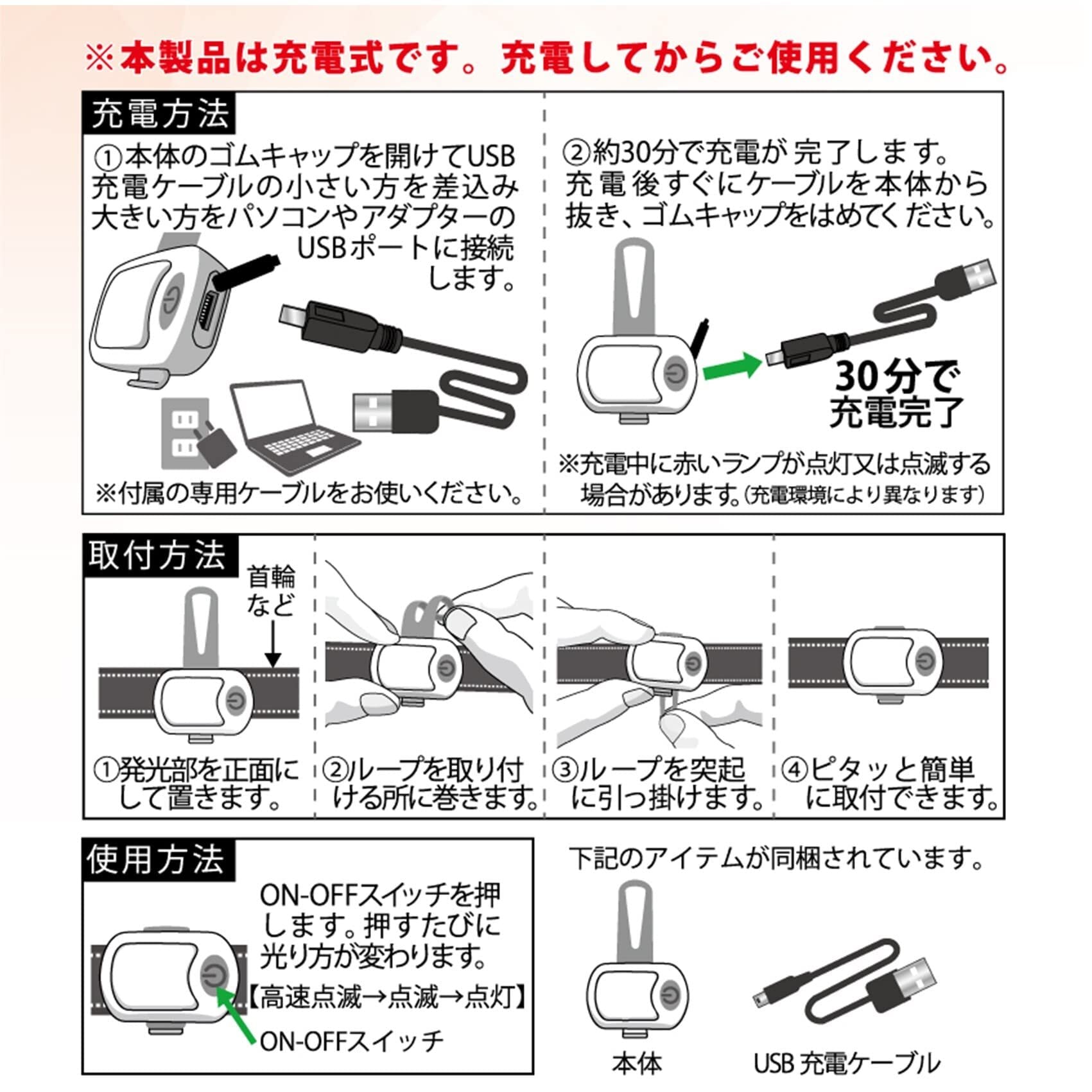 【USB充電式】充電用のケーブルも付属しており、電池交換の面倒がなくなります。