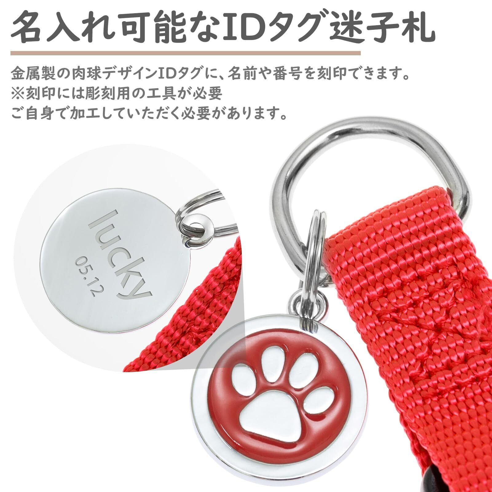 【可愛い迷子札IDタグ付き】:可愛らしい肉球デザインの金属製IDタグ付き。裏面には愛犬の名前や連絡先を刻印でき、木製タグのように腐食しにくい仕様です。万が一の迷子対策にも役立ちます。また、洗濯時には簡単に取り外せるので、お手入れも簡単。愛犬の安全とおしゃれを両立する便利なアイテムです。