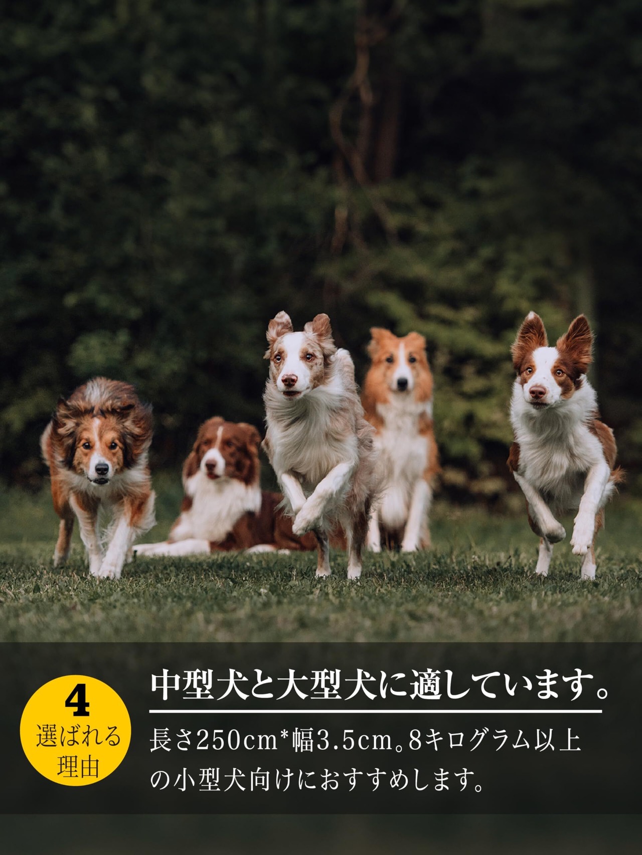 【製品のサイズ】:長さ250cm*幅3.5cm。20000のペットを飼う家族の使用フィードバックによると、250cmの長さがマルチシーンで使用する最適な長さです。リードの3.5cm幅のデザインは犬が噛むのを避けやすいです。同時に広いハンドルのデザインで肩や背のストレスを大幅に減らしてくれます。