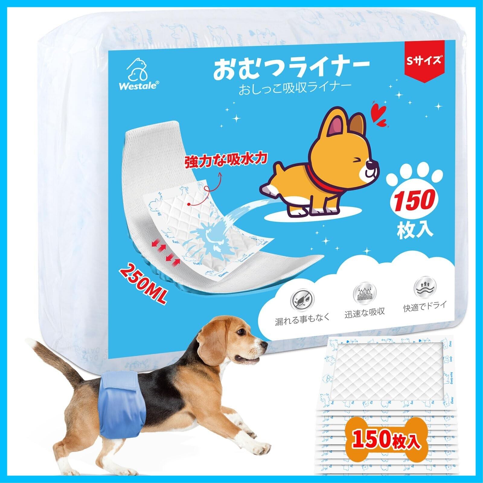 犬用おむつライナー 150枚入 高吸収性能 ずれない 犬 オムツ 男の子 女の子兼用マナーベルトパッド 横漏れ対策 老犬介護 マーキング防止 ペット用おしっこ吸収シート、 Sサイズ