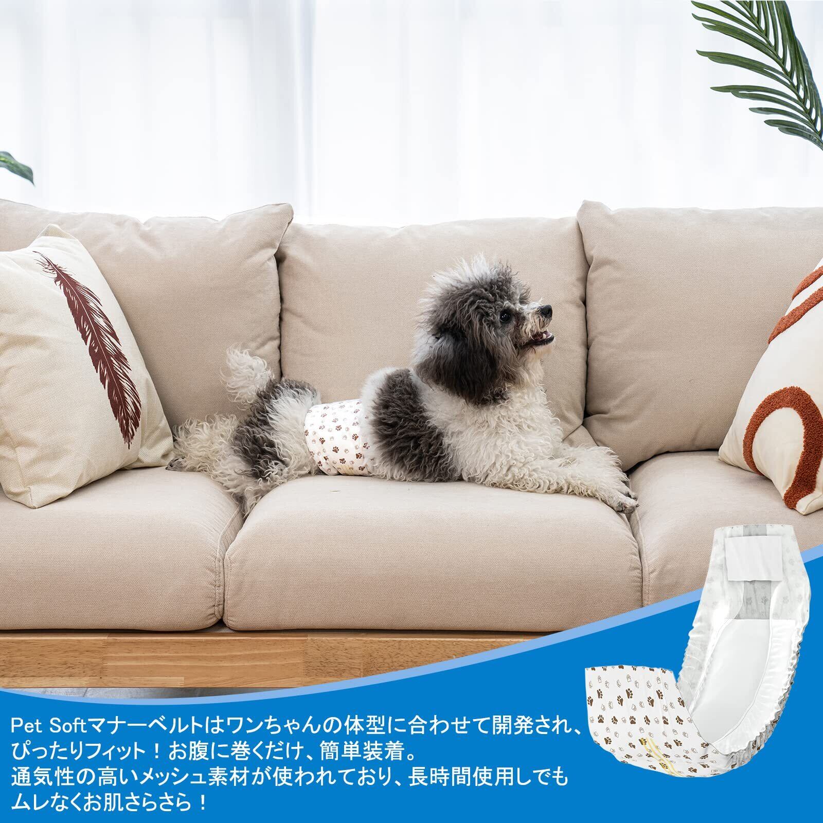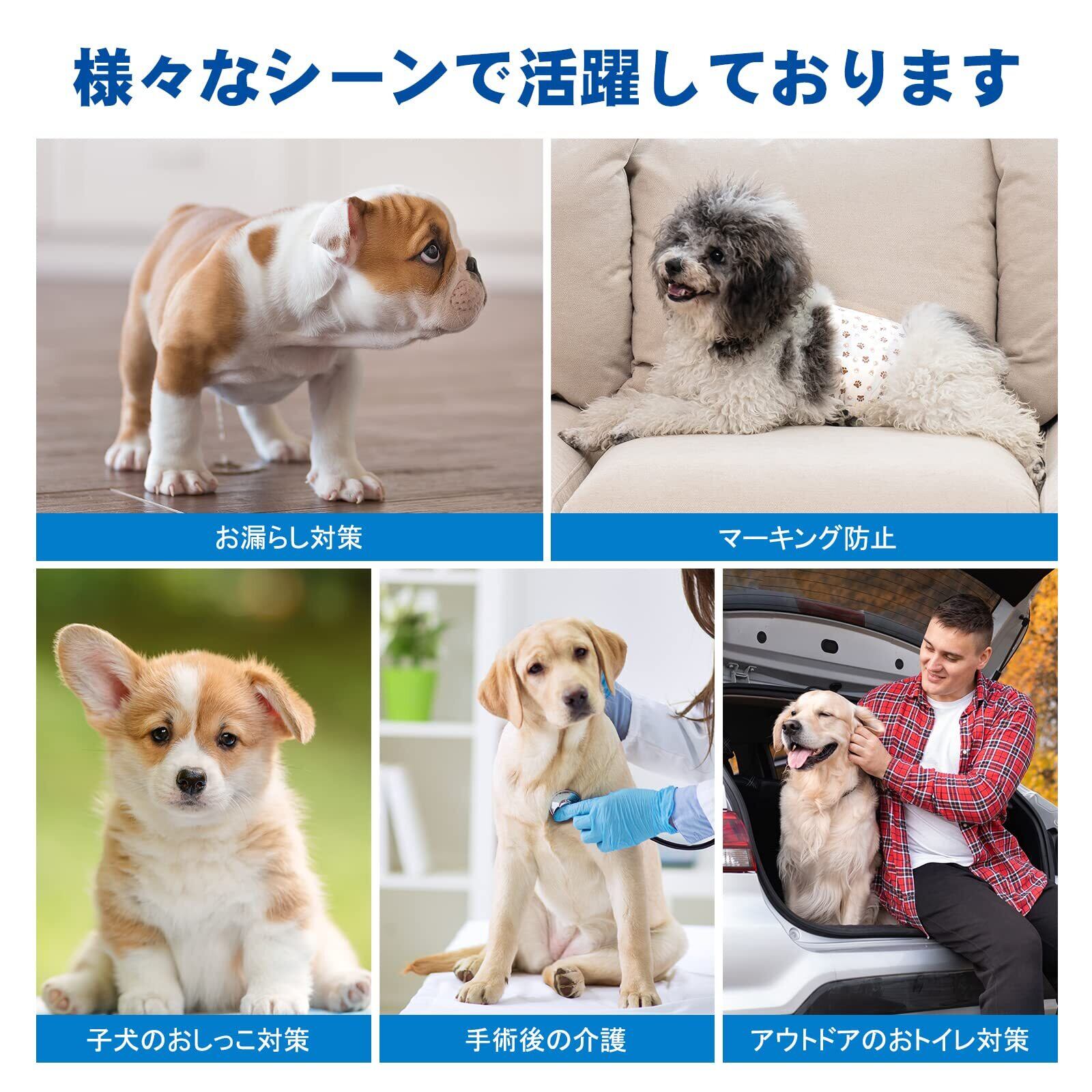製品仕様:XS、S、M、Lの4サイズからお選びいただけます、ご購入前、必ずサイズ表で愛犬のサイズを確認してください、XS本体サイズ:約41×16cm、吸収部サイズ約:約20x8cm、S本体サイズ:53×18cm、吸収部サイズ:約24x10cm、M本体サイズ:62×18cm、吸収部サイズ:約28x10cm、L本体サイズ:77x18cm、吸収部サイズ:約30x10cm、マジックテープ式なので、固定用のマジックテープは大きくて、愛犬に適切なサイズに調整できます、伸縮性の縁で、わんちゃんの動きにもピッタリフィットします