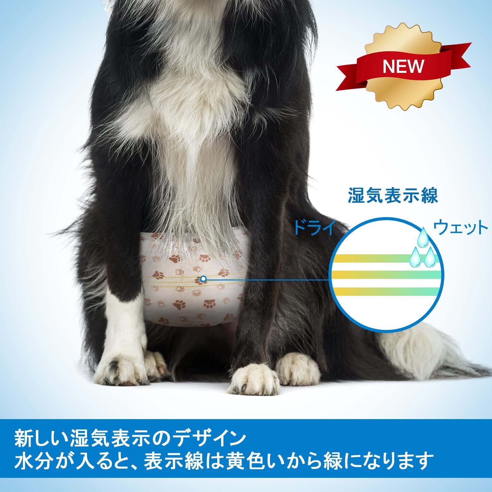 思いやりのあるデザイン:新しい湿気表示線のデザイン、ワンちゃんがオシッコをしたら、オムツが湿気を検出することができ、表示線は乾燥状態の黄色から湿気の緑へ変色します、おむつ専用のマジックテープを採用し、ワンコの体によって調整、ぴったり装着できます、ワンタッチテープで幅が広く、何度もつけ直しでき、ペットの体型にフィットしていつも快適、腹巻風なので、巻くだけで簡単に装着できます