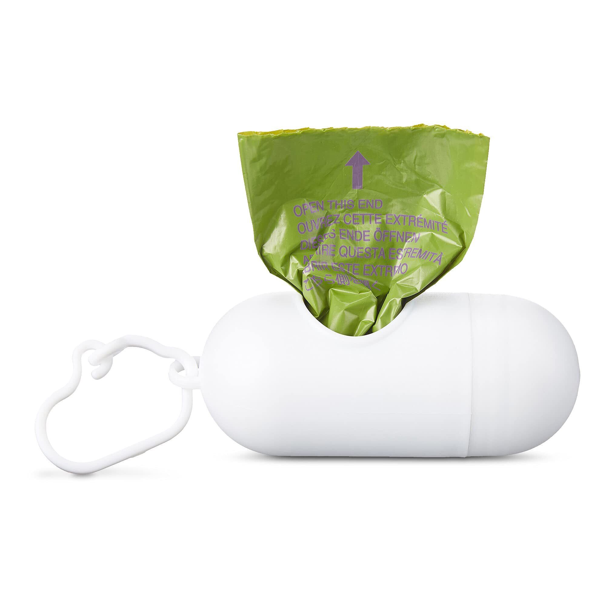 プラスチック製の取り出し容器により、袋をロールから簡単に取り出せます。カラビナスタイルのクリップで、取り出し容器をリーシュに付けられます