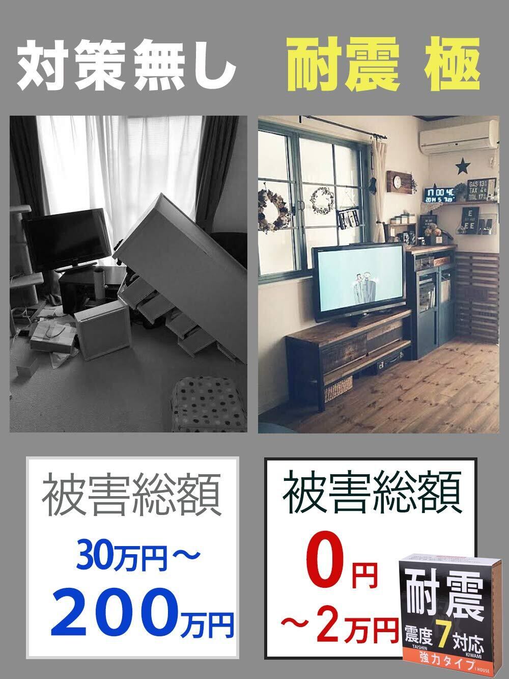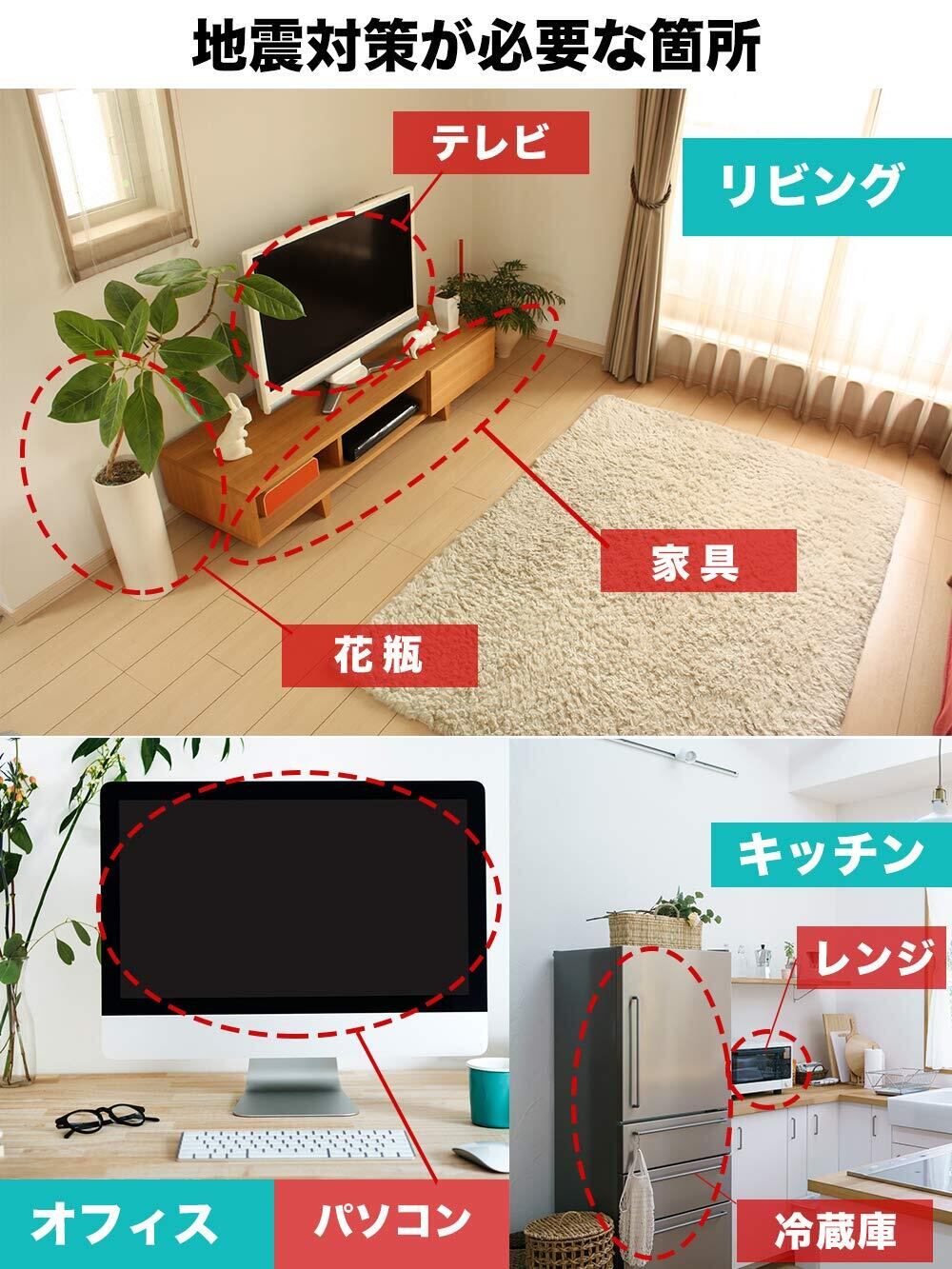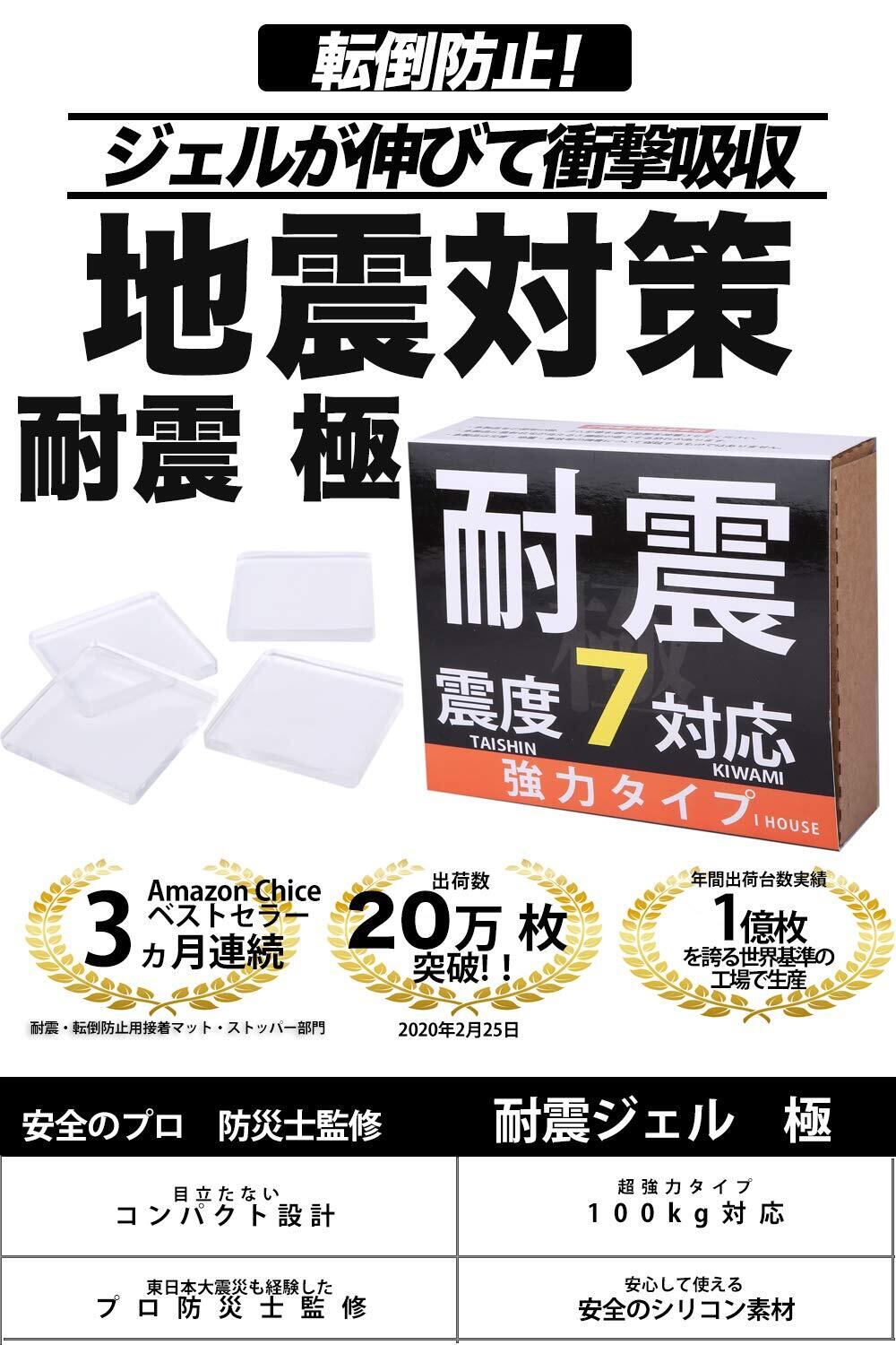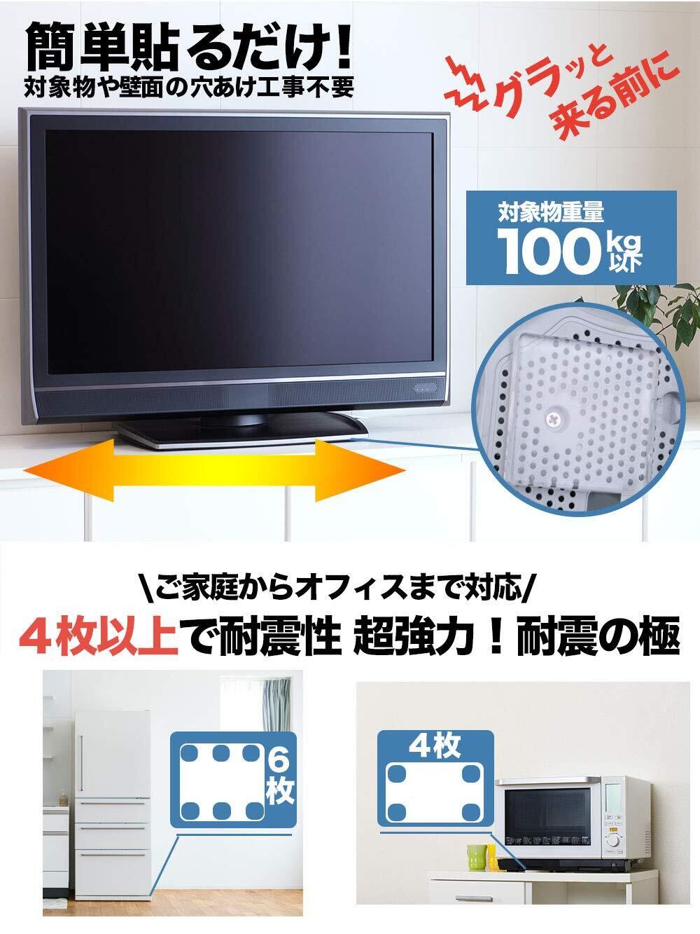 【耐震力No1】震度7対応で東日本大震災クラスの大地震にも対応。4枚以上の設置で耐荷重100kgでトップクラスの耐震力を持つことが可能です。耐震力に重視をして安価なゴム素材を使わずに高品質で厚さ5mm の極厚耐震ジェルで地震から守ります。 4個/8個/12個/20個がご選択可能です。カラー:透明/ブルー。8パターンから用途に合わせてご自由に選んでいただくことが可能です。手軽にご使用できます。