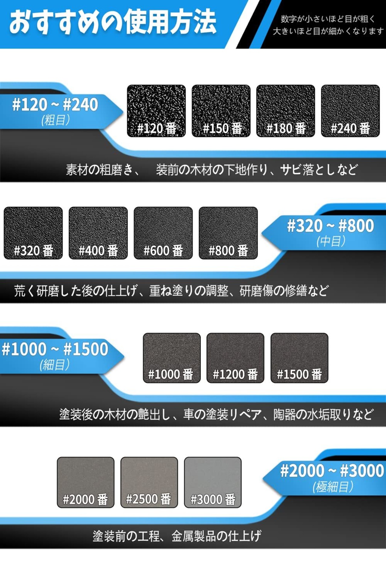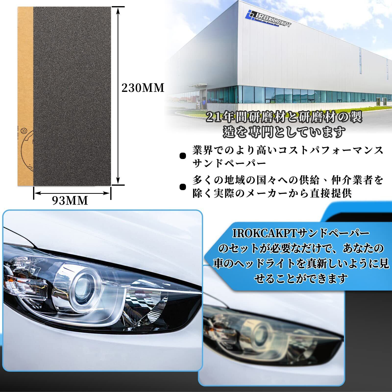 【コスパ抜群ですセット】は面倒な磨き作業をを1つのセットIROKCAKPT紙やすりだけで完結させます;#240:素材の粗磨き、塗装前の木材の下地作り、サビ落としなど#400~#800:荒く研磨した後の仕上げ、重ね塗りの調整、研磨傷の修繕など#1000~#2000:塗装後の木材の艶出し、車の塗装リペア、陶器の水垢取りなど#2500~#3000:車や金属の塗装前の仕上げ