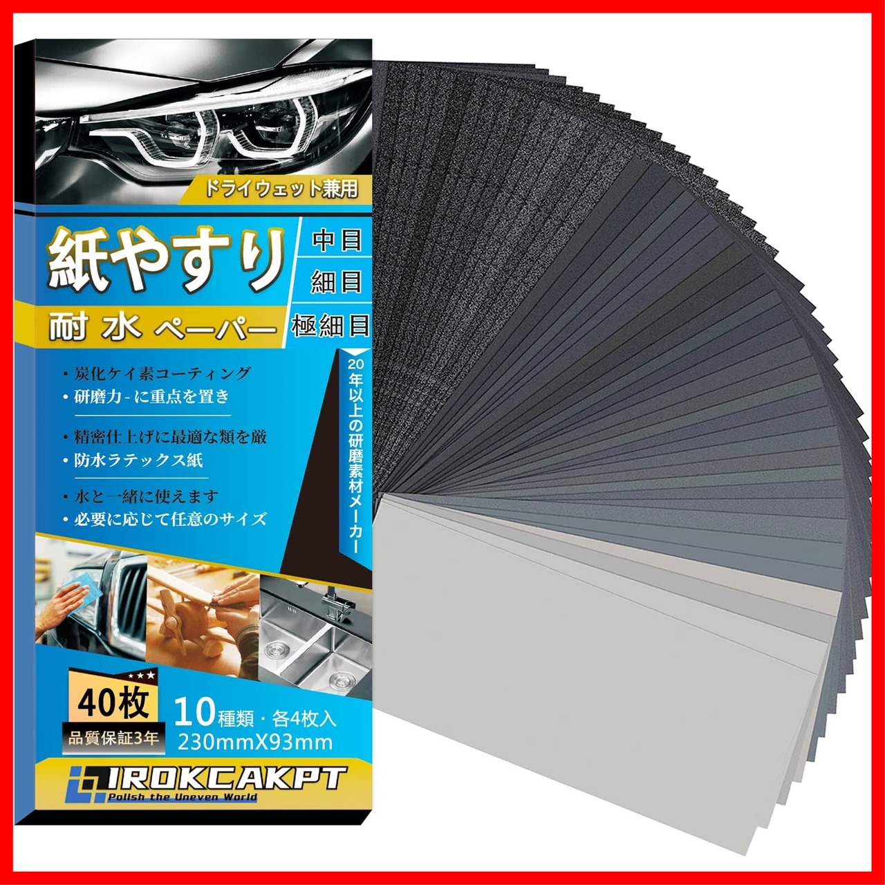 IROKCAKPT 紙やすり 耐水ペーパー 10種40枚セット 紙ヤスリ 230 mm x 93 mm サンドペーパー(240 400 600 800 1000 1200 1500 2000 2500 3000 各4枚)耐水ヤスリ,車 金属磨き 木工DIY作業に キッチンの掃に最適です