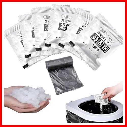 【トイレ凝固剤×高吸水性樹脂|3ステップ直感的操作】 ①便器に袋設置 ②凝固剤を均等散布 ③固化後に密封廃棄。環境配慮型素材|廃棄時も土中分解可能。