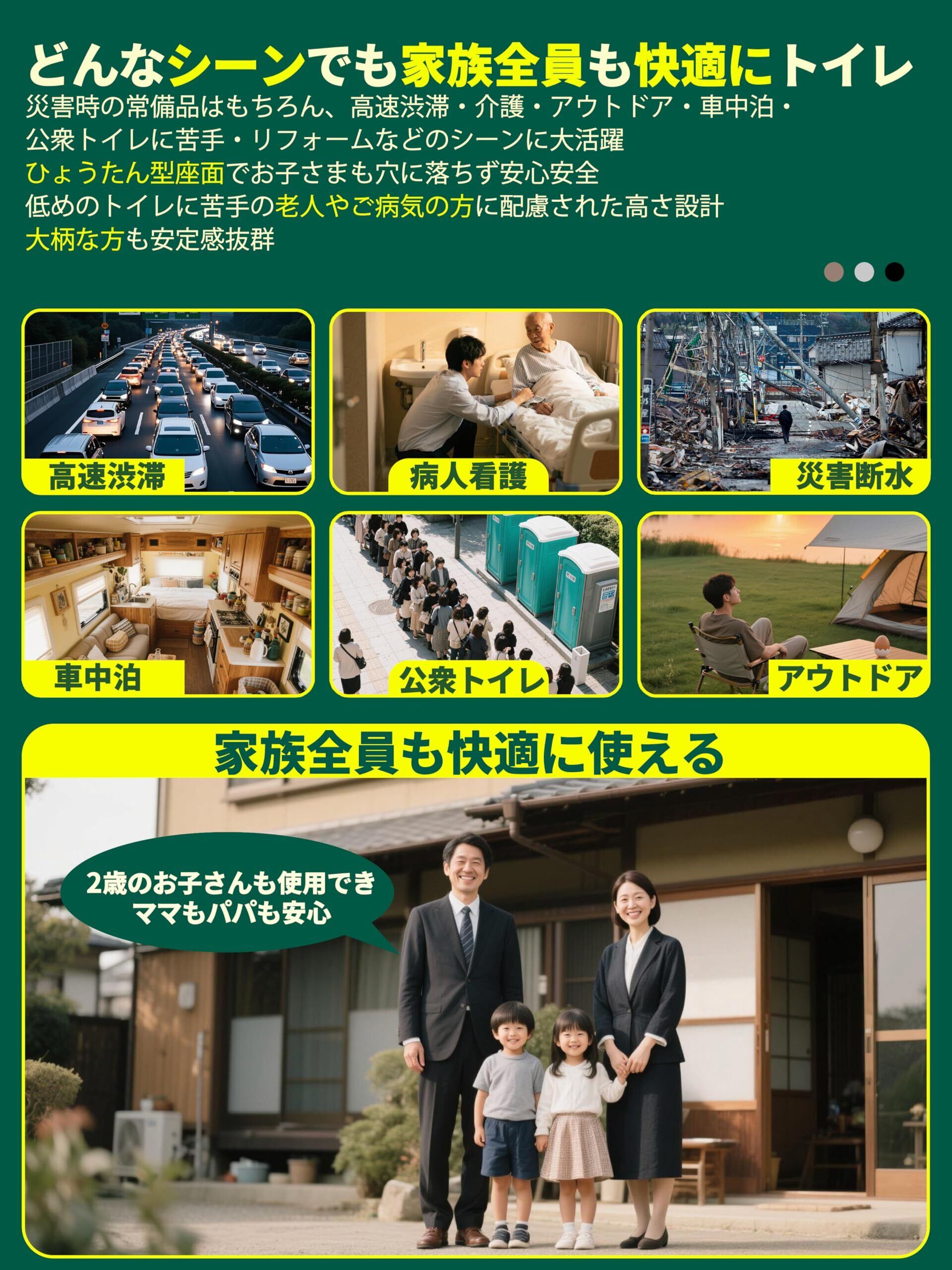 多様シーンと大体重にも対応:アウトドア・断水・高速渋滞・介護など、あらゆる状況で快適にご利用いただけます。材質と構造を徹底的に進化、従来品により耐荷重2倍もアップ、最大200kgの重量も対応!さらに、収納時にも場所を取らないコンパクト設計で、いつでもどこでも便利にご利用いただけます。