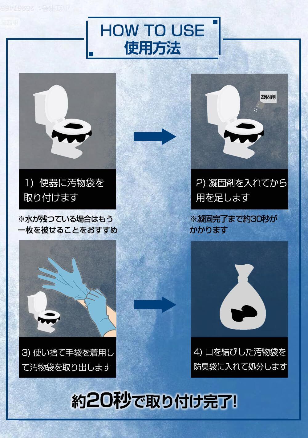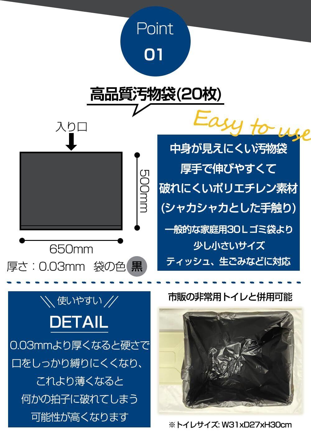 パッケージ内容:使い捨て手袋20枚、消臭袋2枚、汚物袋20枚、凝固剤20袋、取扱説明書1枚