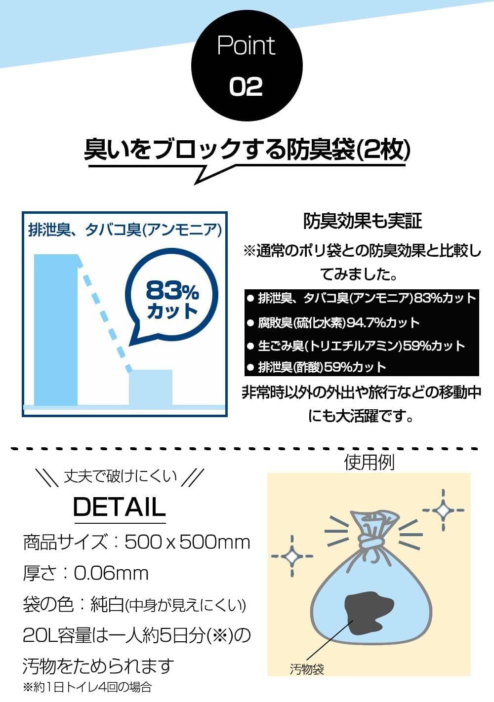 【ハイグレード抗菌・消臭・凝固力】抗菌・消臭性能付きの凝固剤が便や尿を素早くゼリーに固め、臭いや菌の発生を抑えます。トイレした後に汚物袋+消臭袋で二重に包めて、ニオイ漏れを気にせず快適に使えます。