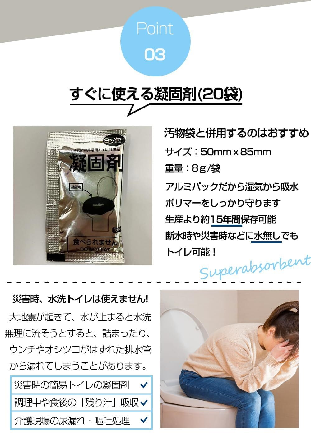 【15年間の長期保管可能】凝固剤には劣化しにくいアルミ製のパッケージを採用することで長期保管を可能にしました。