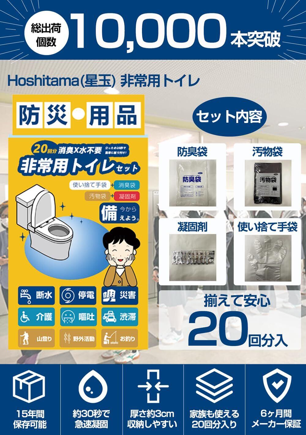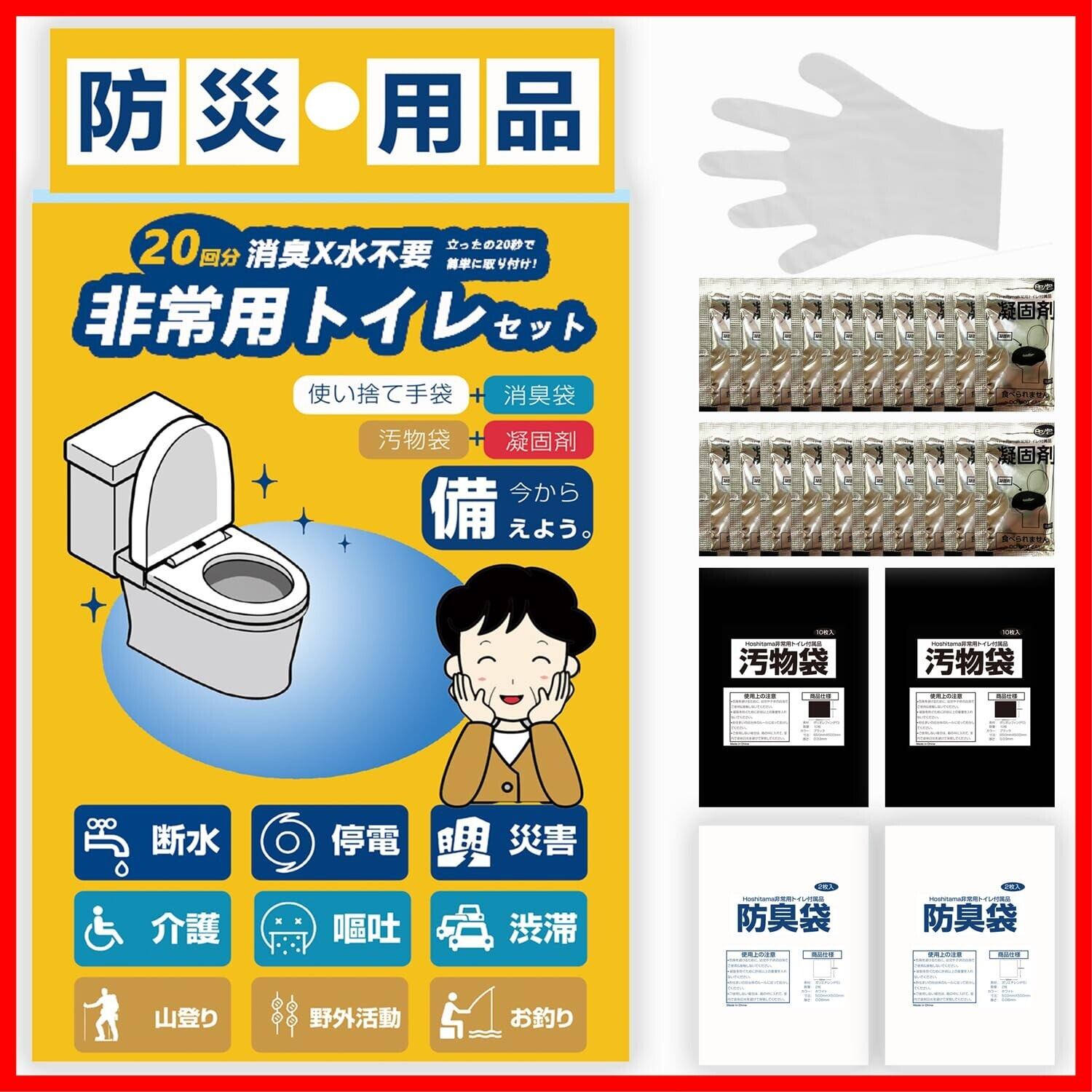 Hoshitama(星玉) 非常用トイレ 簡易トイレセット 20回分 防災グッズ 真空パック 15年保存 使い捨て手袋付き HT-PT20A【アウトドア/介護/地震】