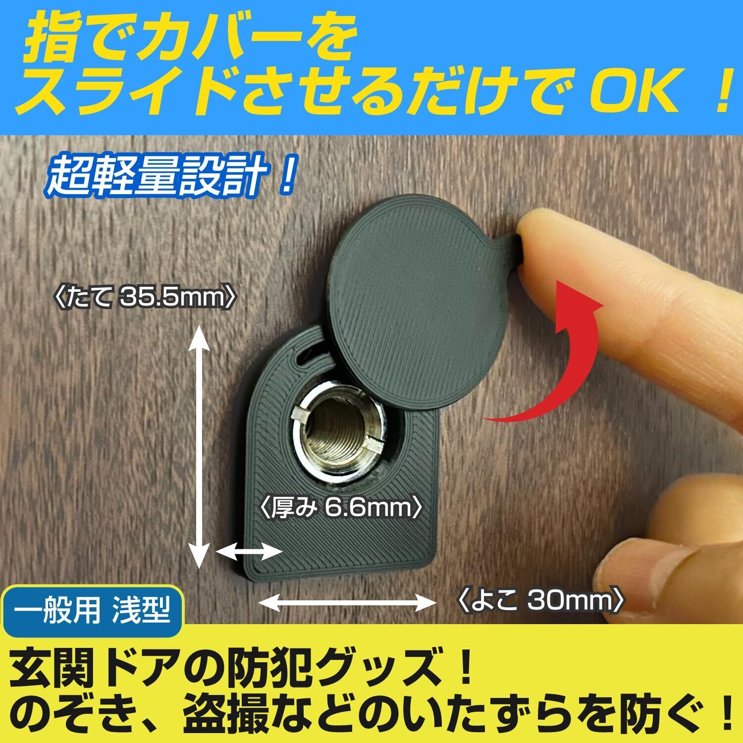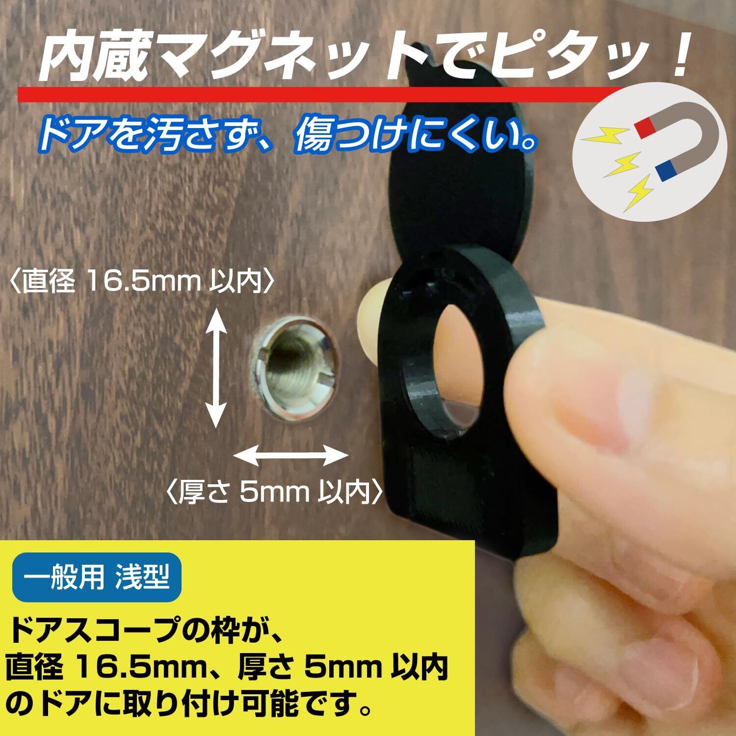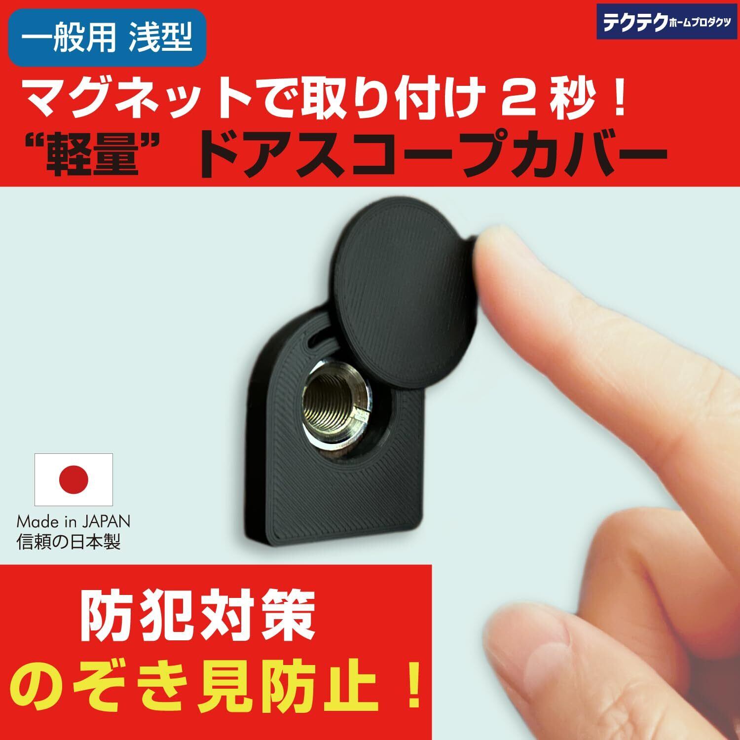 【取り付け可能なドア】マグネット(磁石)がつく平らな面のスチール製ドア(アルミや木製のドアには取り付けできません。)【本体サイズ:一般用 浅型】縦35.5mm×横30.0mm×厚み 6.6mm(カバーを閉じた状態):ドアスコープの枠が直径16.5mm、厚さ5mm以内のドアに取り付け可能です。※覗き見防止用として玄関ドアに取り付ける以外の用途にはご使用しないで下さい。【ご注意】強力な磁石を内蔵しています。アナログ時計、ペースメーカーなどの医療機器、磁気記録媒体(クレジットカード、通帳など)に近づけないでください。内蔵磁石は廃棄の時を除いて、取り出さないでください。取り出した場合は、お子様の誤飲にご注意ください。※安心の日本製(Made in JAPAN)簡易(エコ)パッケージを採用。※製造過程で生じる、ご使用に問題ない程度の表面の筋状の跡、毛羽立ちがある場合があります。