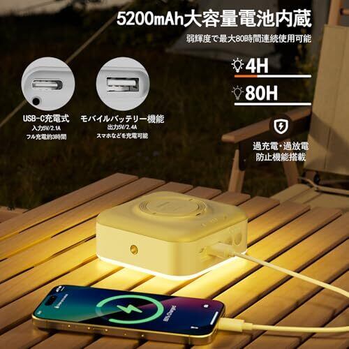 モバイルバッテリー機能付き:LEDランタンは、5200mAhの大容量バッテリーを内蔵しており、スマートフォンを約2回フル充電可能です。停電時やキャンプ、登山などのアウトドアシーンで活躍するだけでなく、非常用の電源としても便利です。これにより、緊急時や外出先でもデバイスの充電が可能で、安心してご利用いただけます。