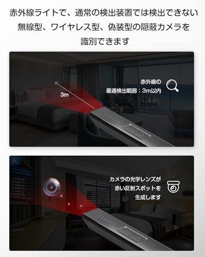 【電波を発しない隠しカメラも検出可能】カメラレンズに反応する赤外線レーザーと専用フィルターを搭載しており、目視で隠しカメラを探し出せます。特に電波を発していないカメラやスパイデバイスの発見に効果的です。また、点滅パターンを変更することで、カメラの発見がさらに容易になります。