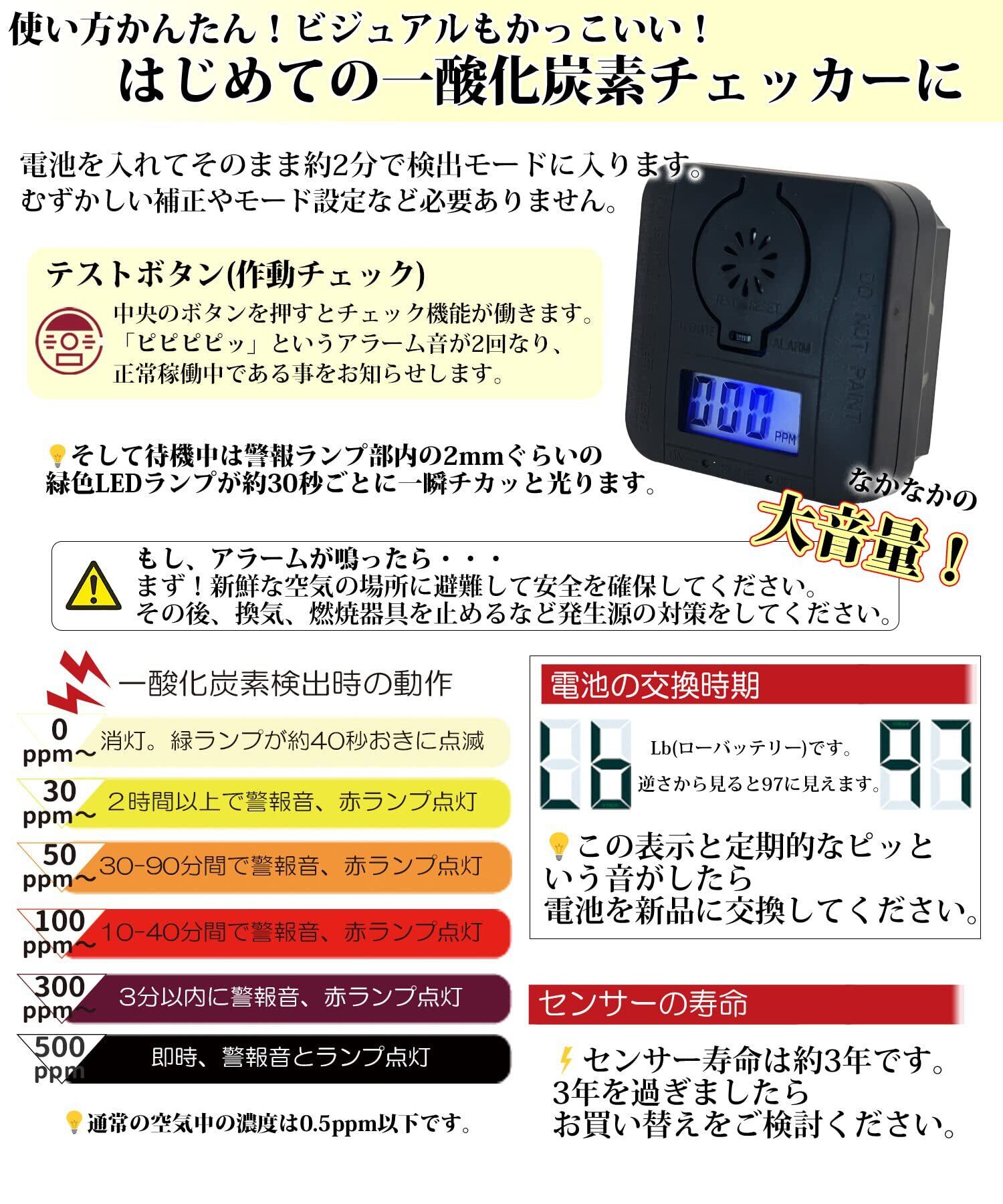 【光と音でお知らせします】光る赤い警報ランプ、大音量の警報音、濃度レベルを知らせるLCDディスプレイの3段構成で危険をお知らせします。 [表示なし]異常なし。緑色のLEDランプが30-40秒おきに点滅します。 [30ppm-]2時間以上続くと警報音、赤ランプ点滅 [50ppm-]30-90で警報音、赤ランプ点滅 [100ppm]10-40分で警報音、赤ランプ点滅 [300ppm-]3分で警報音、赤ランプ点滅 [500ppm-]即時、警報音、赤ランプ点滅※濃度が一定値を超えるとアラームを鳴らす機器であり、リアルタイムモニターや測定機器ではありません。