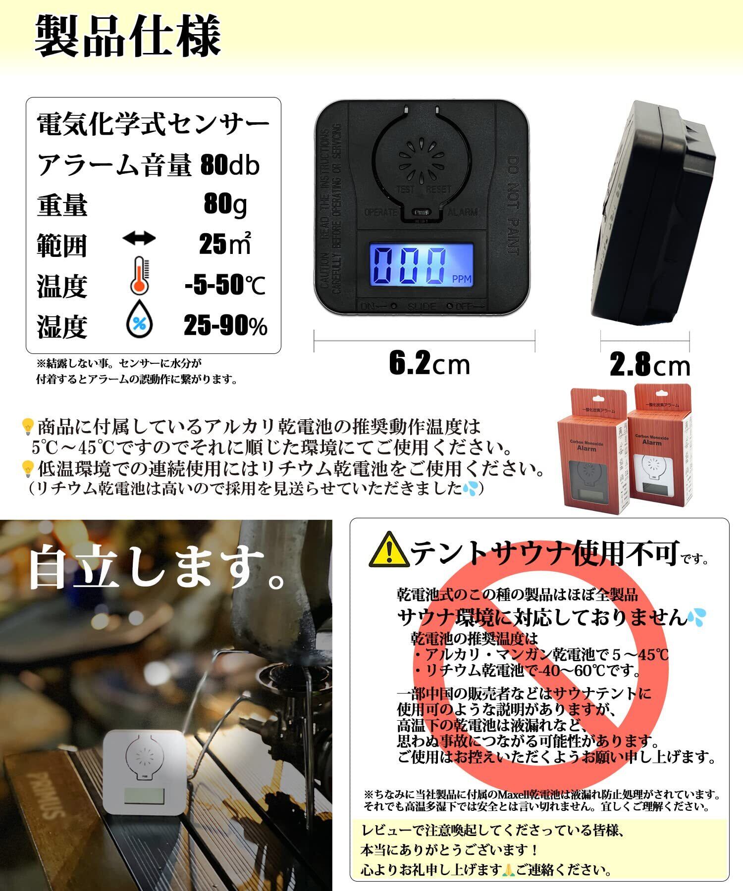 【 設置場所】電池込みでも約70グラムと軽量でいろいろな場面にてご使用いただけます。キャンプなどアウトドアシーンで、石油、灯油、ガス、薪、炭などを燃焼させる機器(石油ストーブ、薪ストーブ、ガスストーブ、炭火グリル等)が設置されている場所に携行してください。