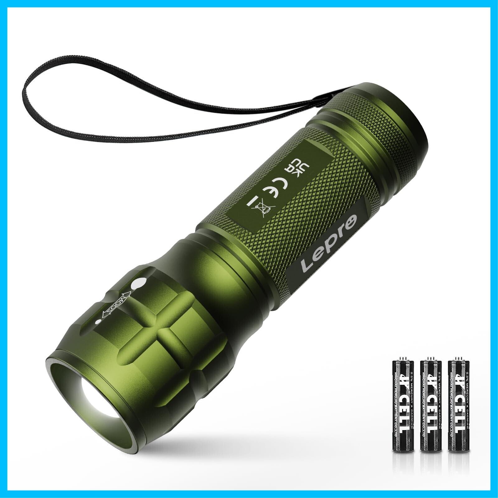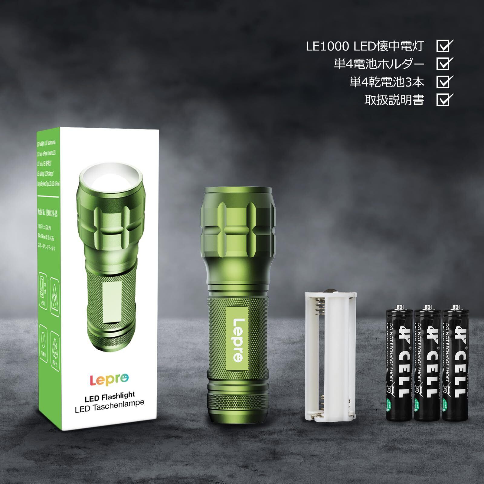 LED 懐中電灯 フラッシュライト ハンディライト 高輝度チップ搭載 ズーム調節 軽量 小型 電池式 単四電池付き 防災 停電対策 緊急用 キャンプ 登山 夜釣り グリーン(1200012-G)