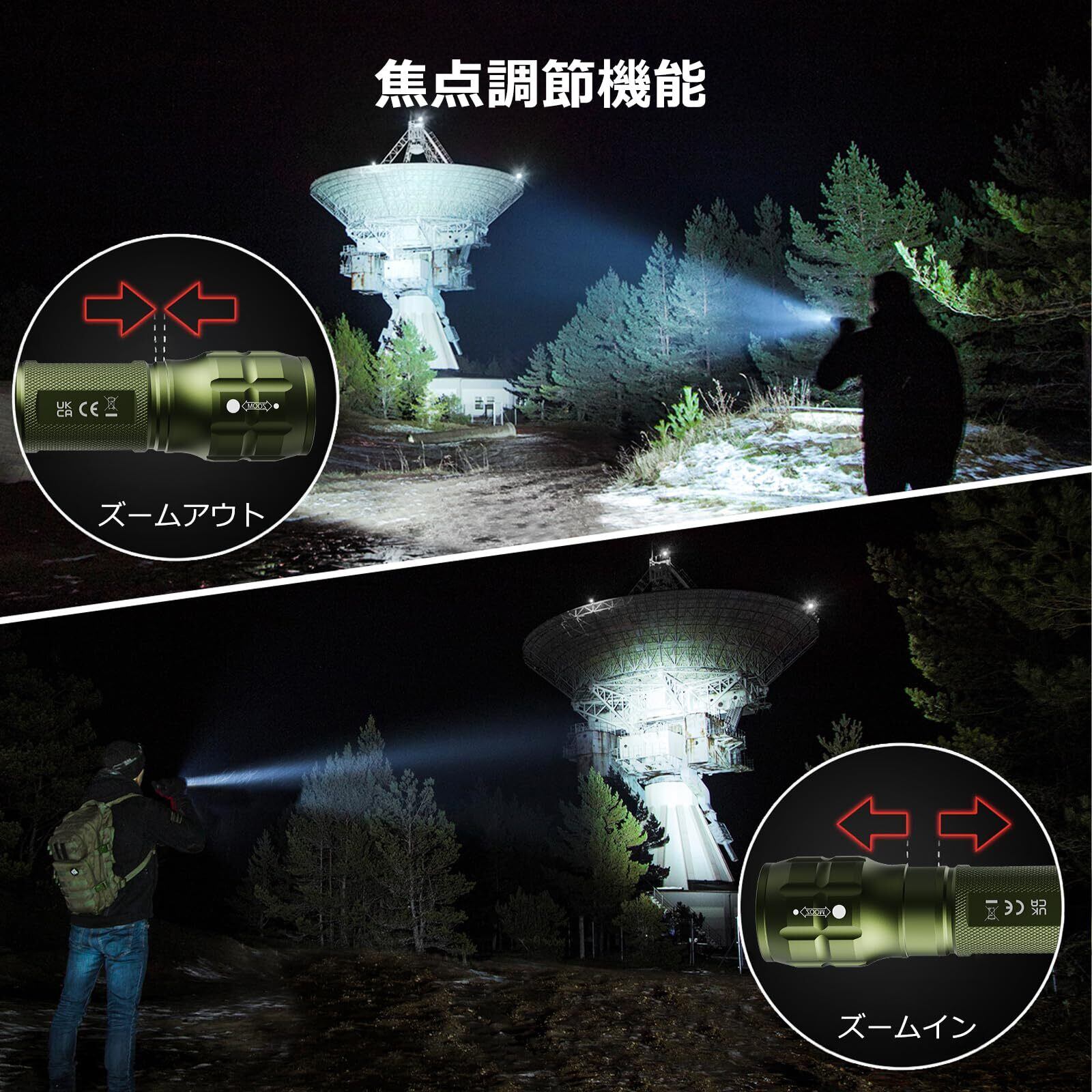 【便利なズーム式】本懐中電灯は伸縮式のフォーカスレンズを搭載して、ヘッドを引っ張り光の焦点距離と照射範囲を調整でき、ニーズに応じてご利用可能。今まで夜間の安全に困っていたお客様にお勧め。