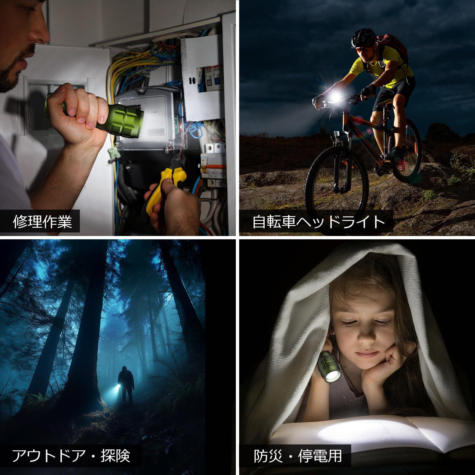【防滴仕様】防水等級IP44のため、日常生活の雨水などによる水滴の付着や飛沫程度なら、懐中電灯本体に悪影響なく耐えることができます。夜に自転車、散歩、キャンプ、アウトドア時に突然の雨が降りだしても心配はありません。