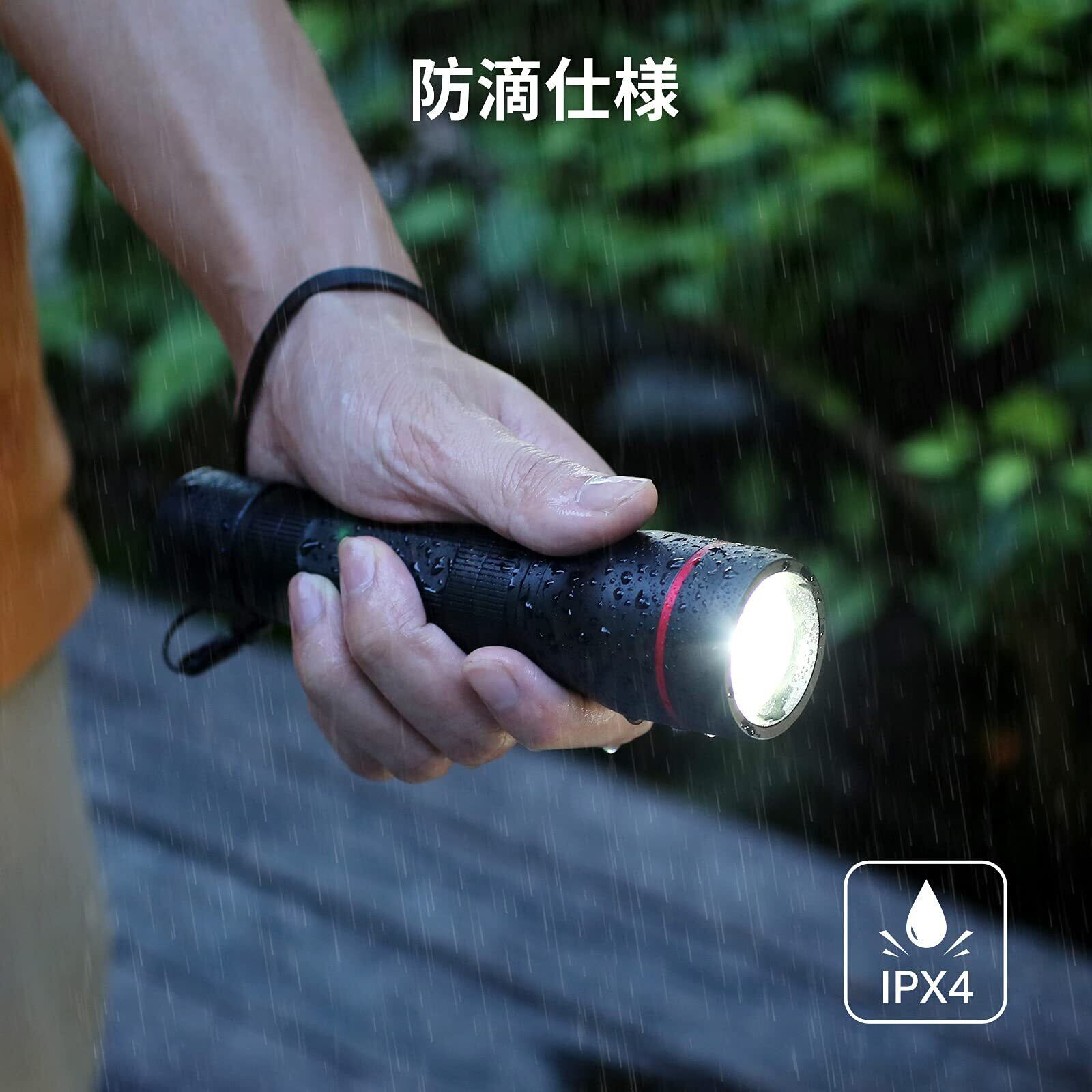 【防滴仕様】防水等級IPX4に準拠しているので、日常生活における雨水などによる水滴の付着や水しぶきにも耐えられ、懐中電灯本体に悪影響を与えません。夜に自転車、散歩、キャンプ、アウトドア時に突然の雨が降りだしても心配する必要はありません。