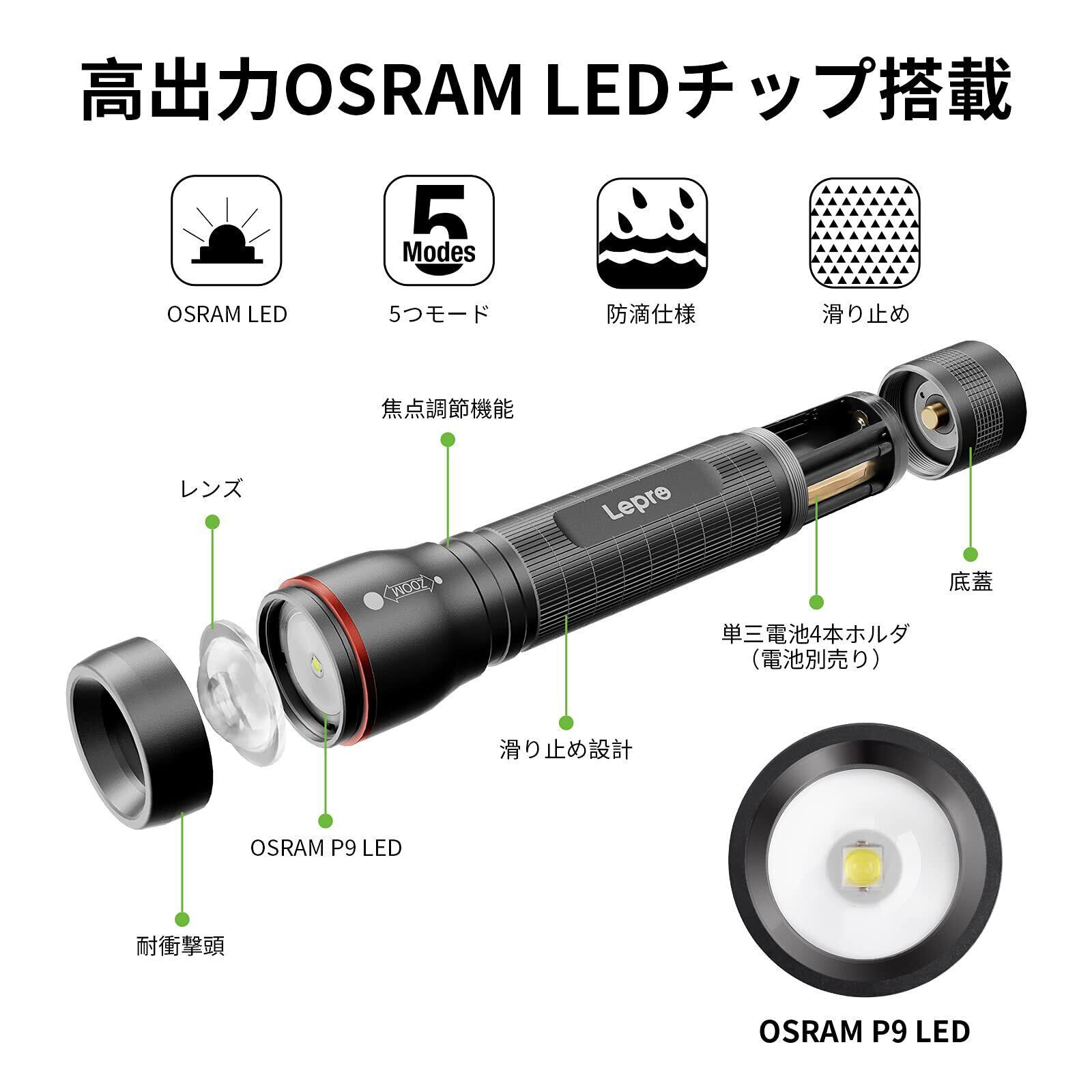 Lepro LED懐中電灯 OSRAM社製超高輝度LED搭載 単三電池対応 ハンディライト フラッシュライト 強力 軍用 【LE3000/超高輝度/ズーム式/5つ点灯モード/防滴】電池式 防災 停電対策 緊急用 新型 軽量 キャンプ 登山 夜釣り