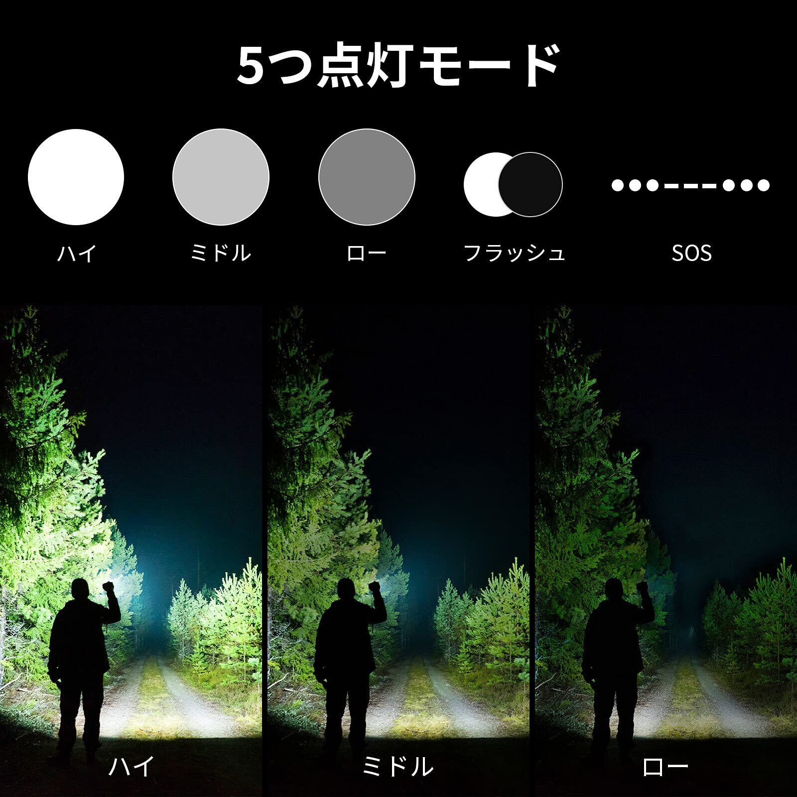 【便利なズーム式・5種類の点灯モード】この懐中電灯には、伸縮式のフォーカスレンズが搭載されており、ヘッド部分を引っ張ることで光の焦点距離や照射範囲を調整することができます。これまで夜間の安全性を気にしていた方におすすめです。さらに、ハイ、ミドル、ロー、フラッシュ、SOSの5つの点灯モードを搭載しています。用途に応じてモードを変えられるので、とても便利です。